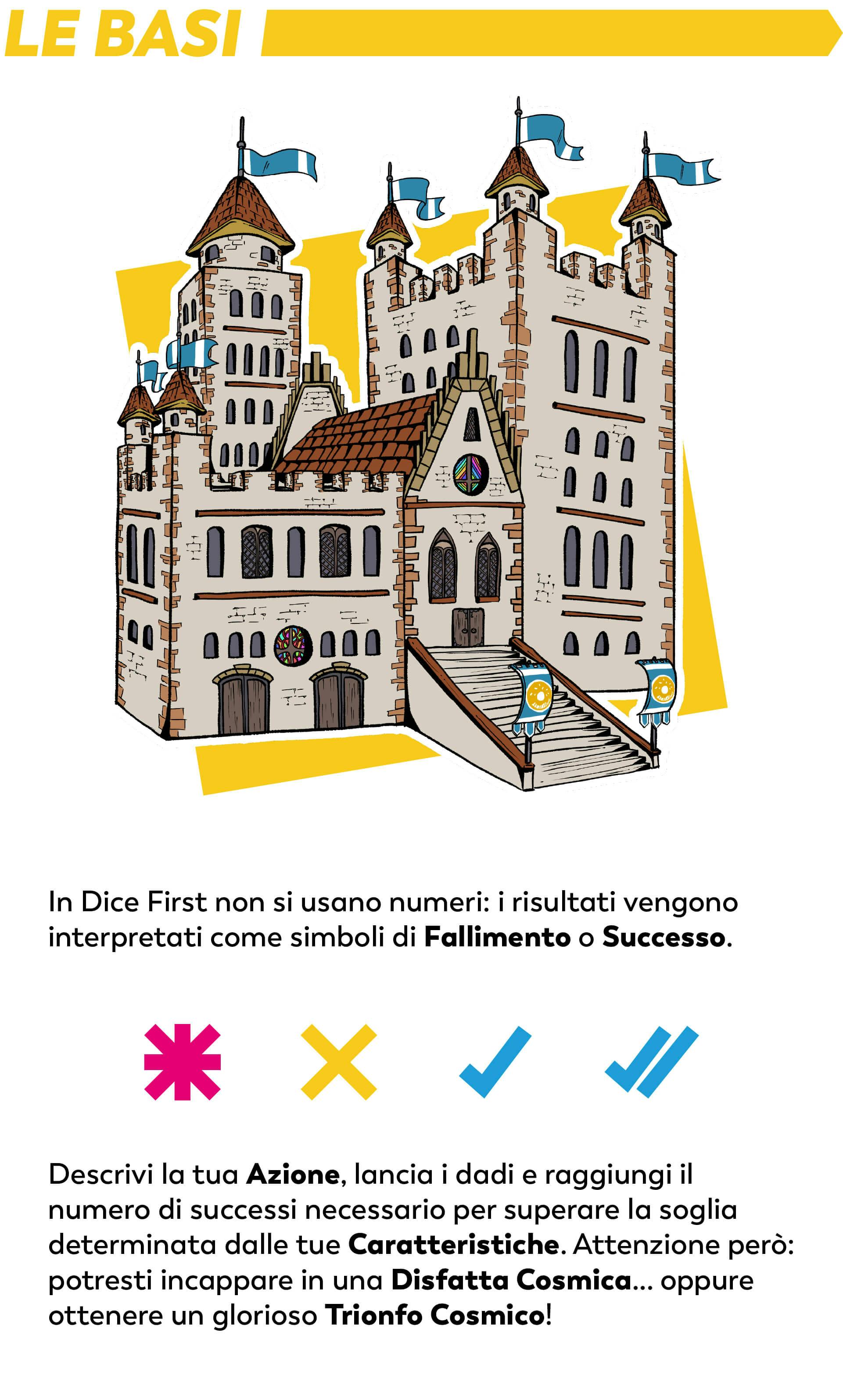 In Dice First non si usano numeri: i risultati vengono interpretati come simboli di Successo o Fallimento.