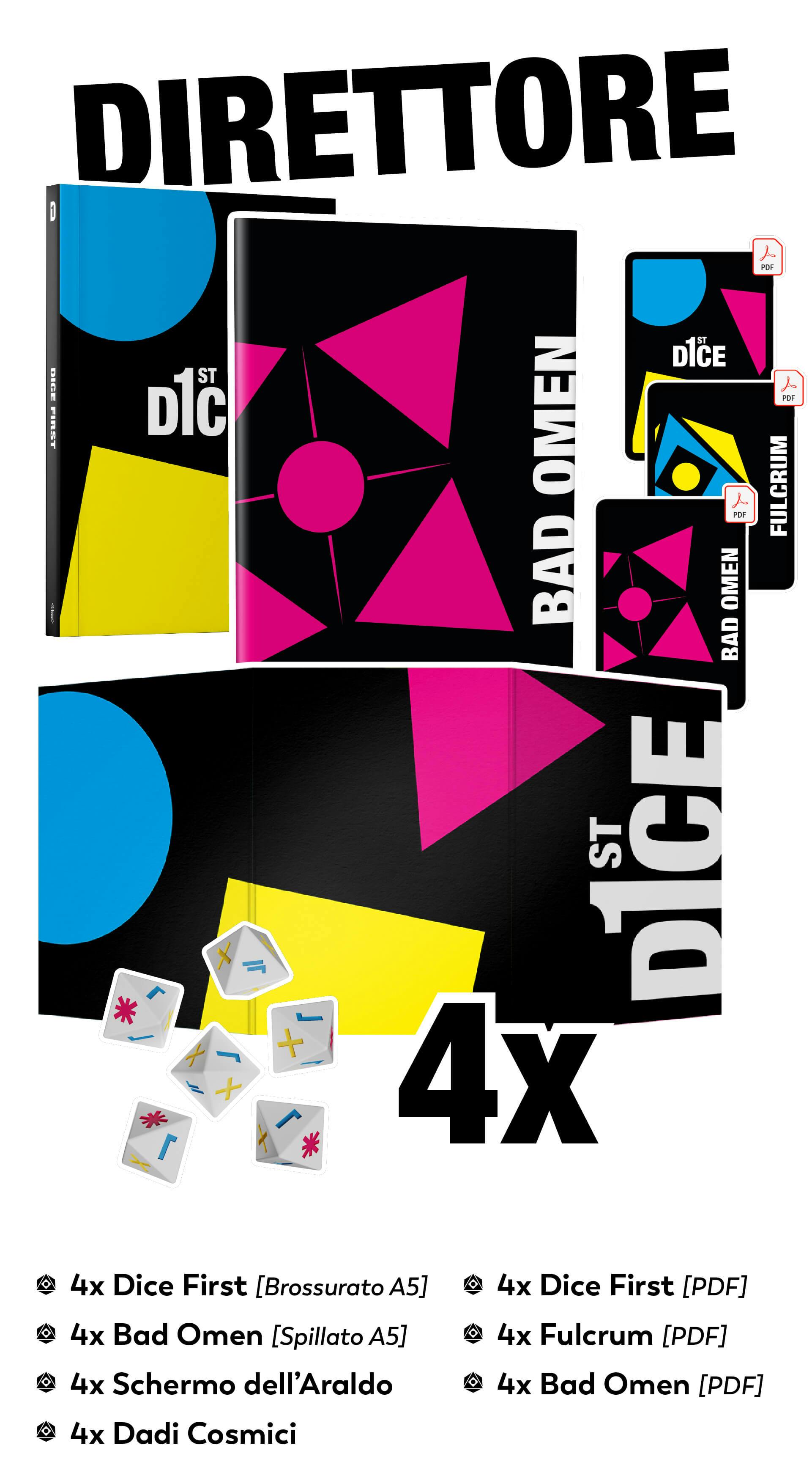 Il Direttore è pensato per negozi, associazioni e gruppi di gioco: include 4 pledge Operativo a prezzo agevolato, ideali per portare Dice First su più tavoli di gioco.