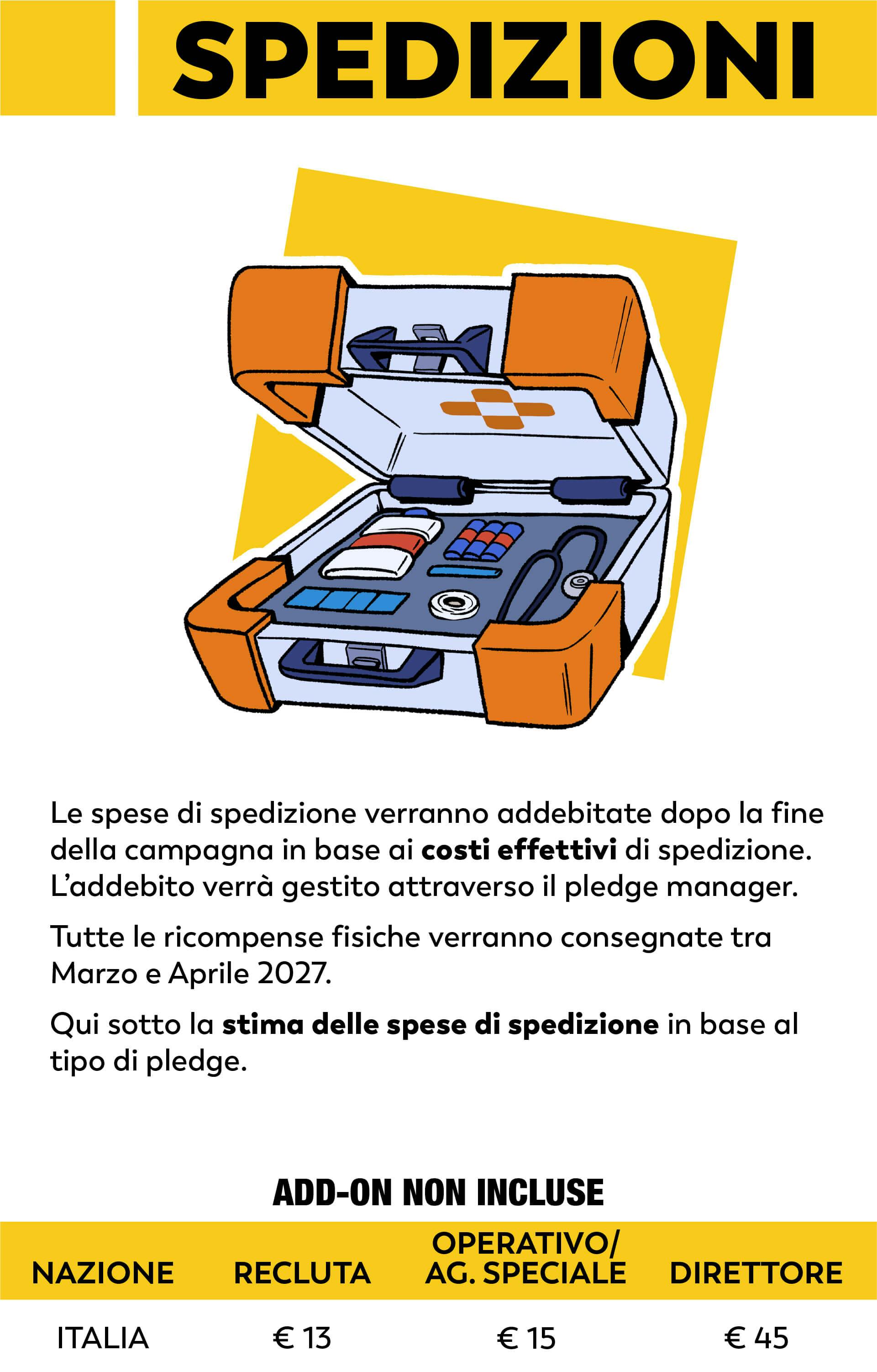 Le spese di spedizione verranno addebitate dopo la fine della campagna in base ai costi effettivi di spedizione. L’addebito verrà gestito attraverso il pledge manager. Tutte le ricompense fisiche verranno consegnate entro la fine di Marzo 2027.