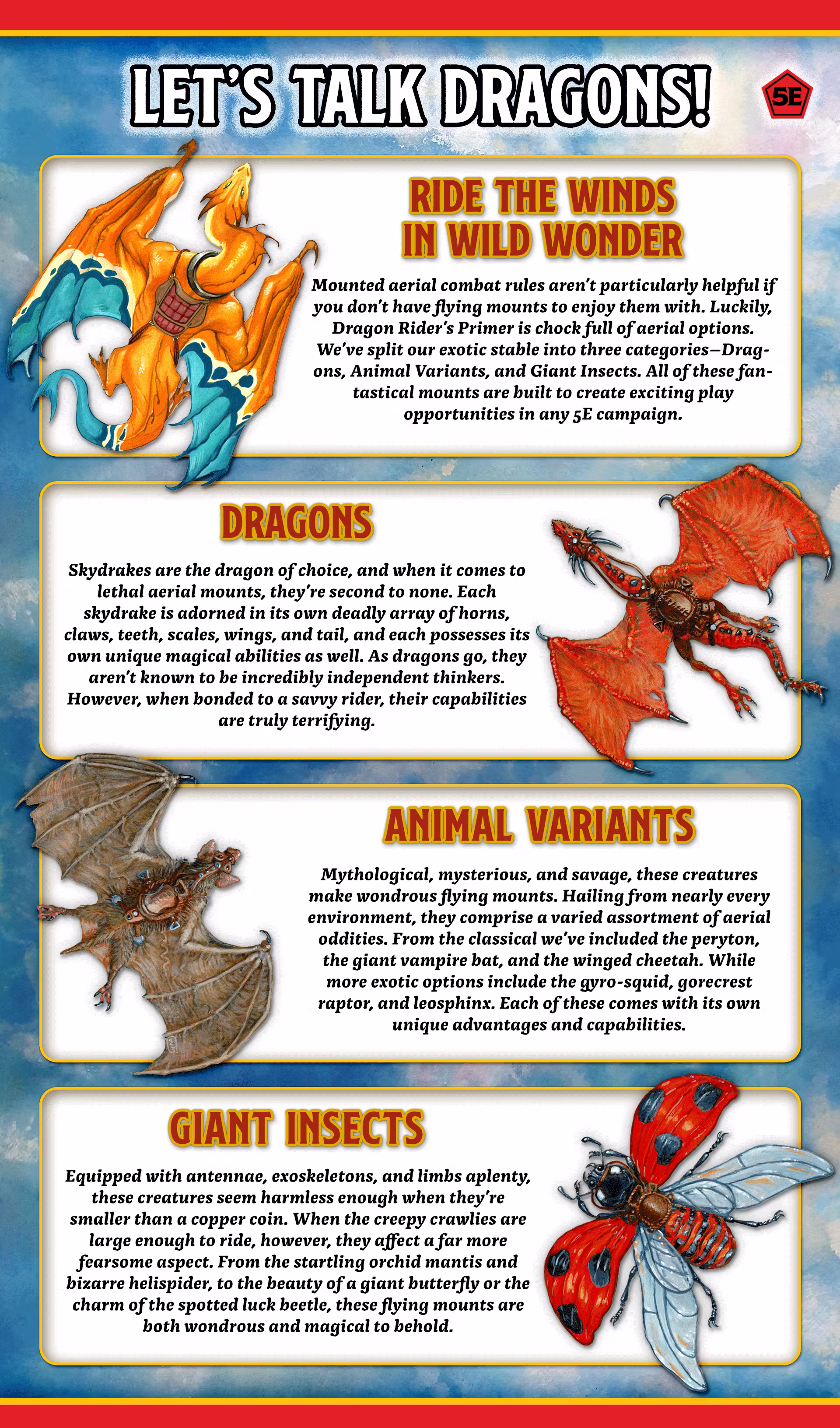 This crunchy 5E sourcebook elevates your adventure to new heights with flying mounts for all characters and their adversaries!
