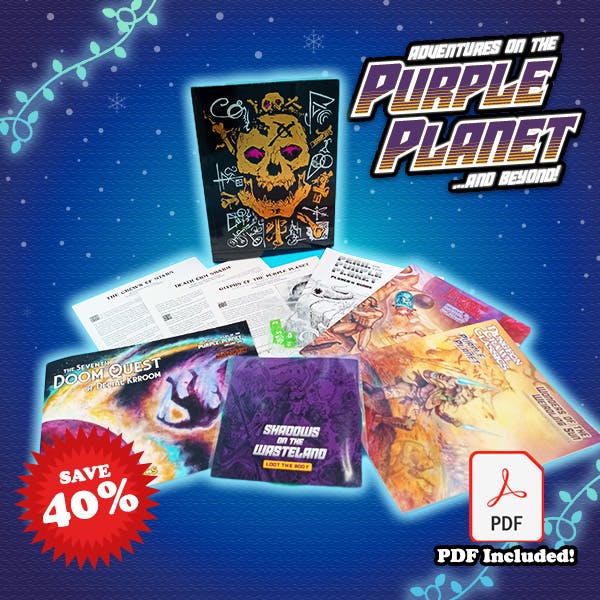 Save 40% from MSRP and grab all that's left of the exclusives and bonus items from the Purple Planet crowdfunding! This pledge level includes the foil hardcover edition of Tome of Adventure Vol. 4: The Purple Planet, plus the judges screen, stretch goal pack, bonus 3d6, flexi-disc, indie zine Doom Quest of Delial Krroom, and several of the cardstock one-shot bonus pages!