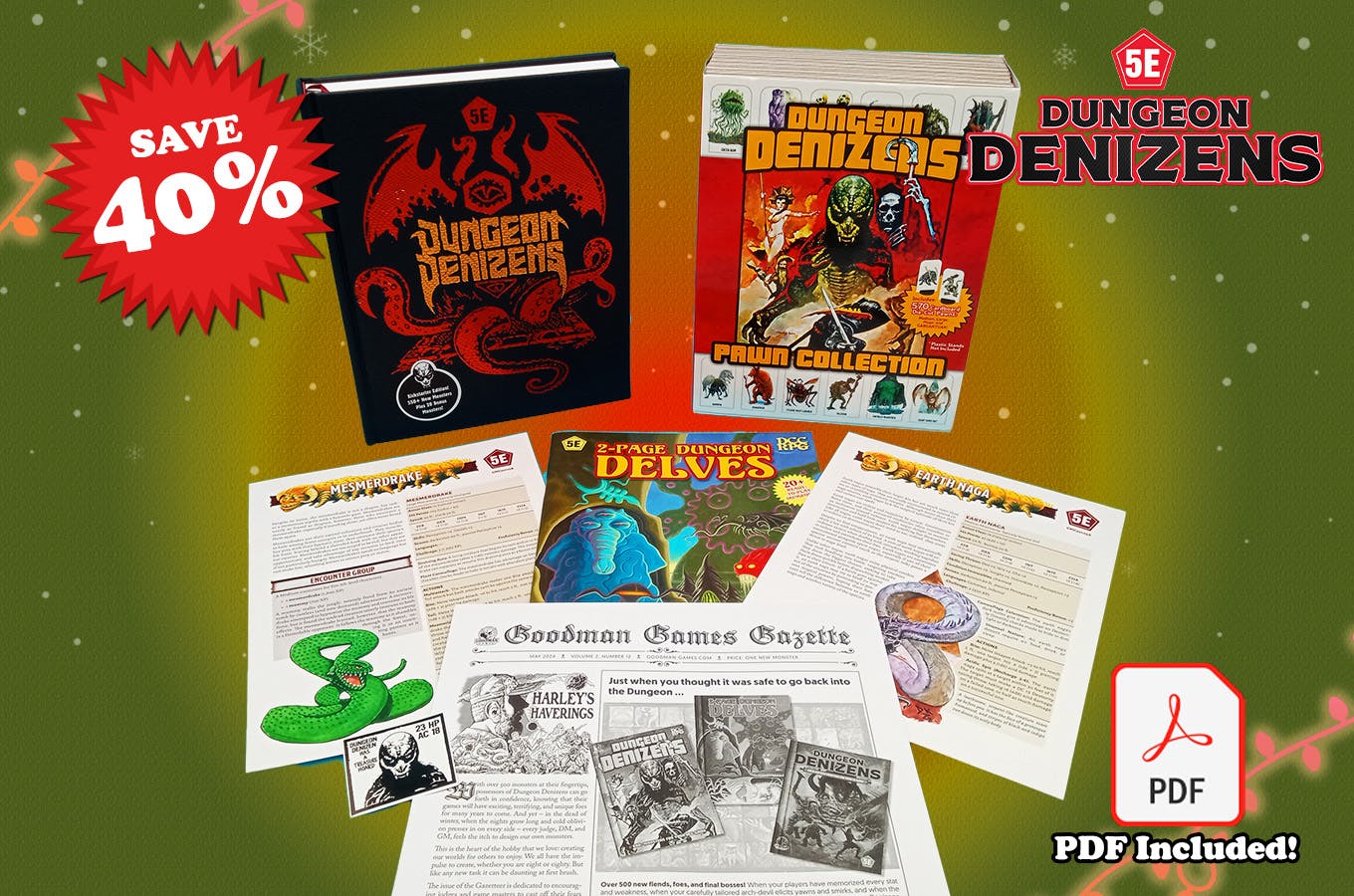 Save 40% from MSRP plus get a free PDF! This monumental 5E pledge level includes all the Dungeon Denizens goodness and stretch goals. You'll receive the two-tone foil reptile-hide special edition of the book, which has the extra 16 bonus pages in the back which aren't included in the regular edition, for a total of more than 550 fully-statted, full color monsters! Plus you'll get the cardstock pawn collection, 2-Page Dungeon Delves, and the Mesmerdrake and Spirit Naga stretch goals, plus Goodman Games Gazette, sticker, and PDF editions!