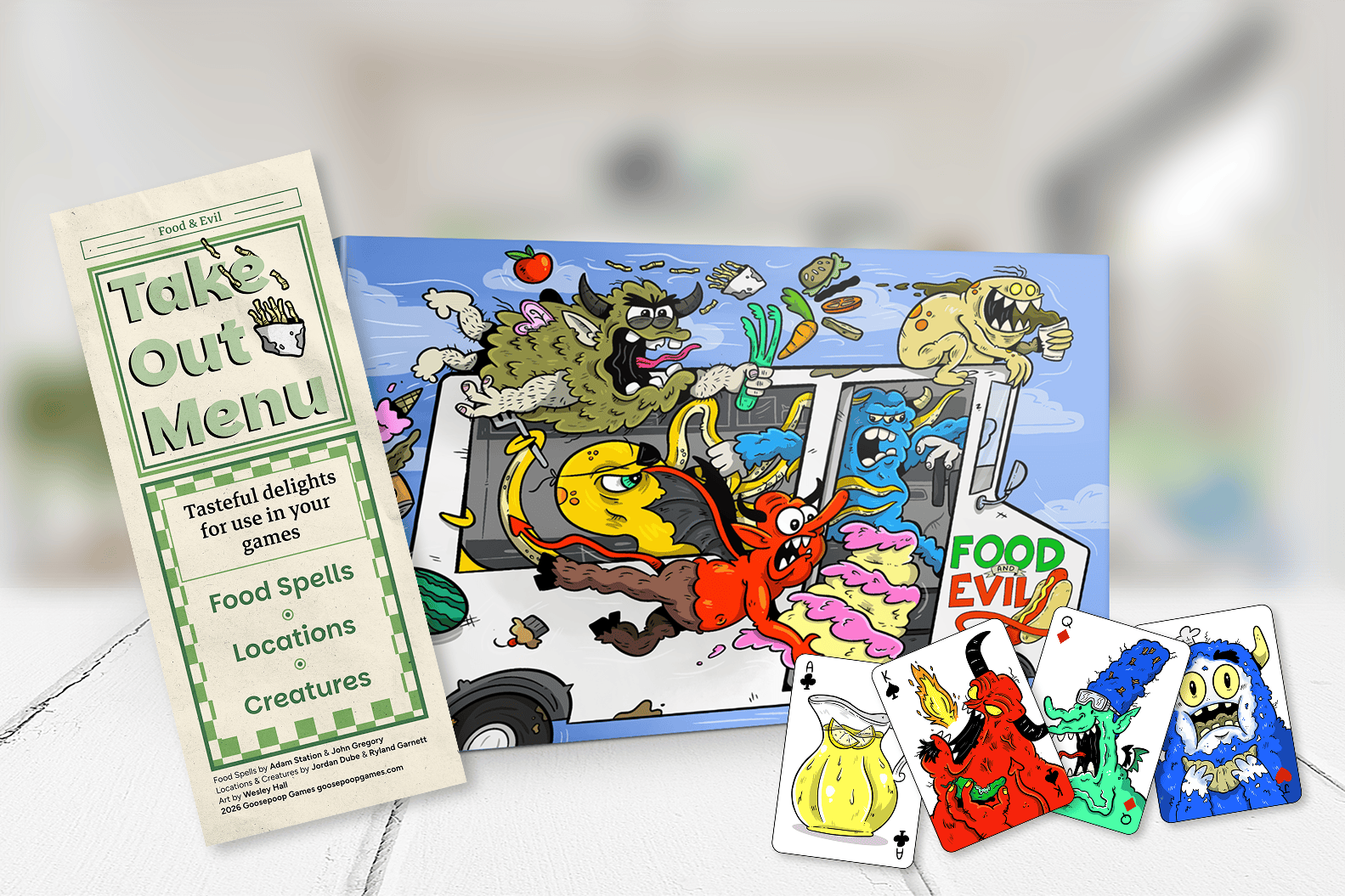 That’s over 10 adventures, over 100 Locations, 100 Creatures, 50 Food Spells, 54 Custom cards deck, 200 page rippable player sheets, and sleek food truck wheels to display your box.