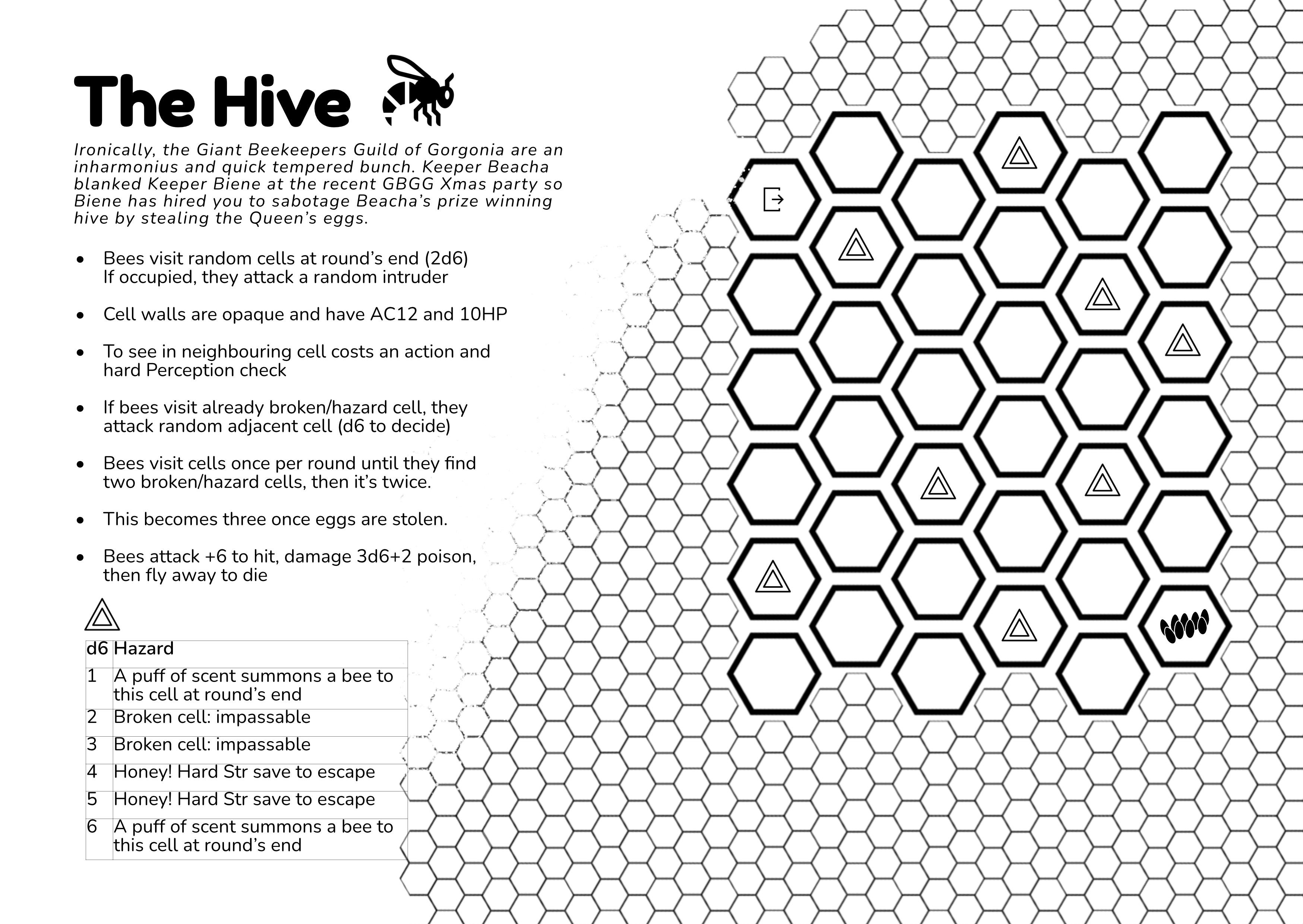 Easy there, stud. There are 6 (get it?) encounters you can drop into your game. Moments for when you need something to take up a session or half a session or to answer a specific need. This zine will include an escape from a treetop kingdom, a buzzy vault heist and a hexciting Mad Max race scenario! All the maps will be in the zine but also supplied as digital files (player and DM facing versions) with every pledge.
