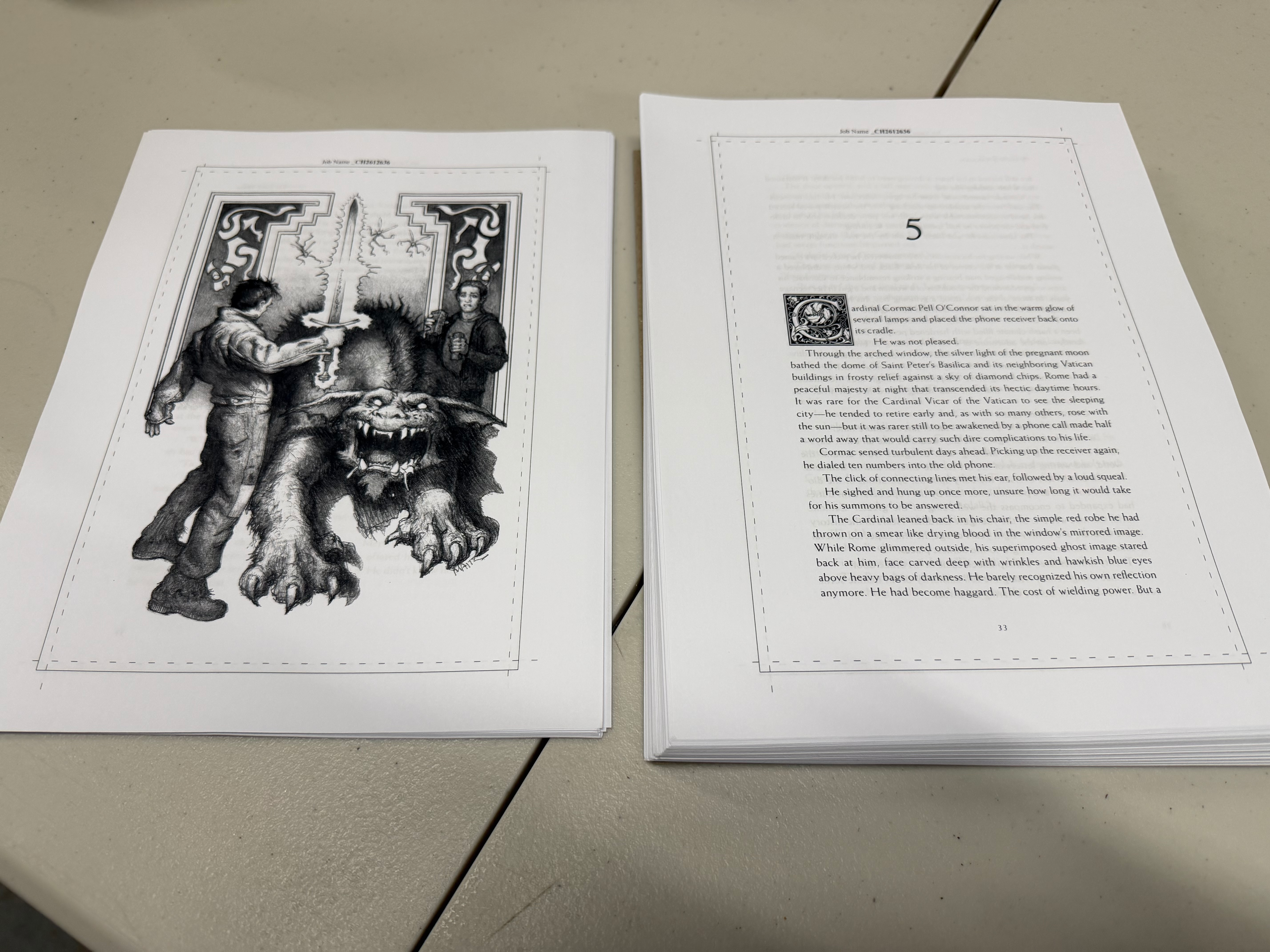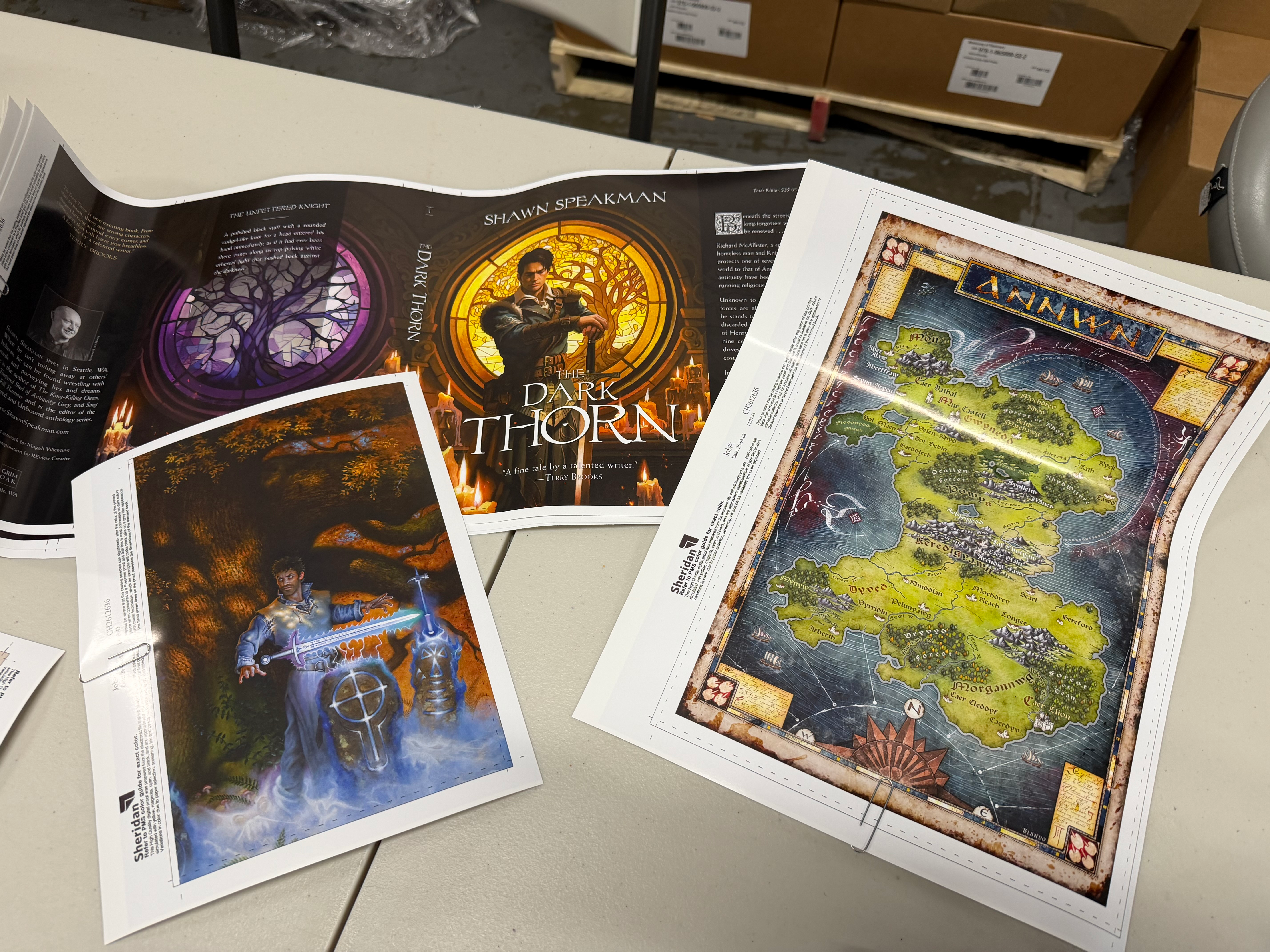 But I thought I'd share that I received proofs for The Dark Thorn. The printer is a bit behind on this but I received them, I approved them, and now the project can move forward at the printer. Below, there are two pictures so you can see what proofs look like. I'm especially excited about the Map of Annwn being folded and placed into upper tier books in a unique way. More on that when I receive copies.