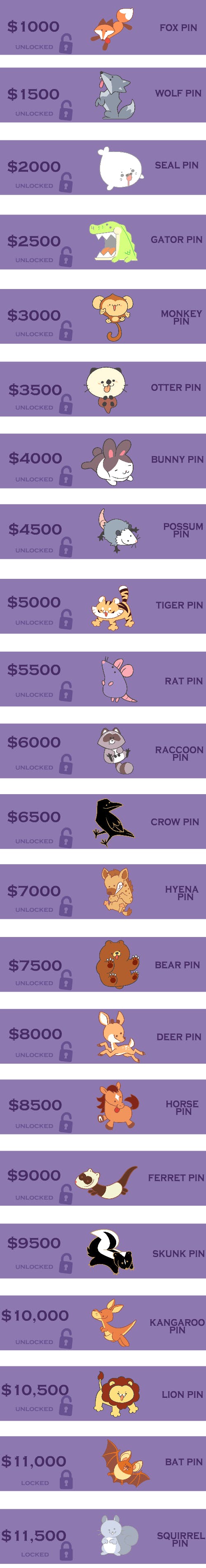 If we meet the initial funding goal, there are many, many more pins that can be unlocked! Please check out the chart below to see what critters are up for grabs~!