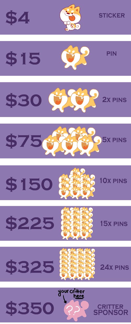 To ensure full customer satisfaction, please feel free to email me at [email protected] if you have any specific questions about the Critter Sponsor tier! For this campaign, I am strictly doing custom animal pins (wild, domestic, anything is a-ok!) and not OCs! Thank you very much for your understanding!