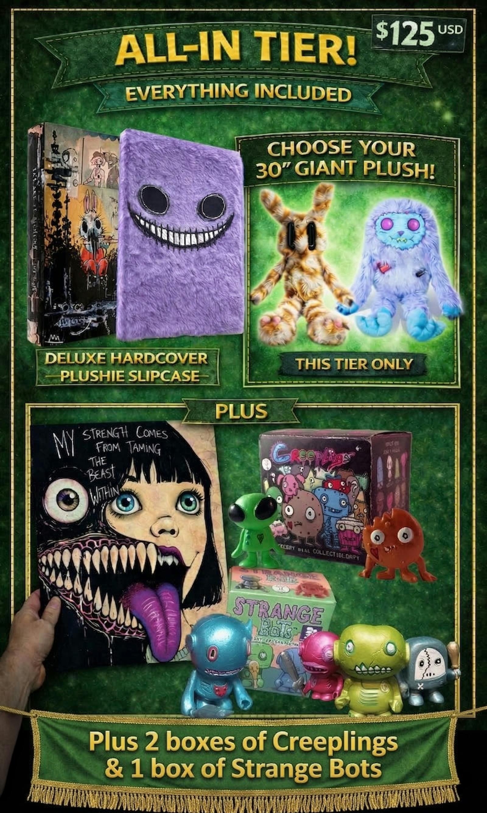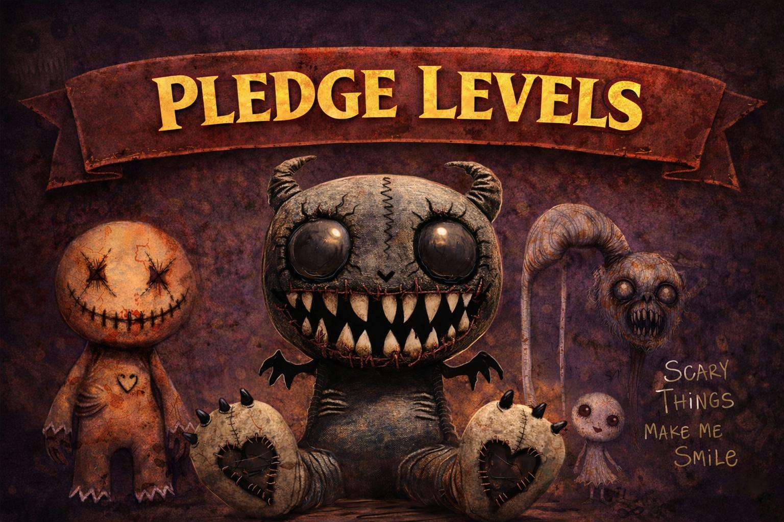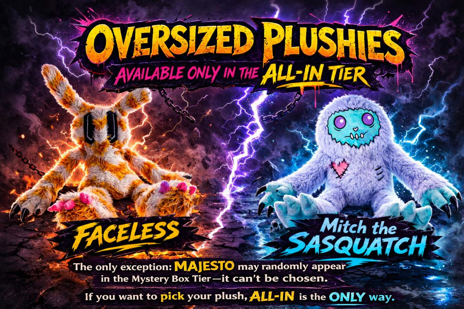 Choose one of our two bunny designs from the Bunny Box, or step into something bigger with our oversized plushies. For the ultimate collectors, Faceless and Mitch the Sasquatch are only available in the All-In tier, making them some of the most exclusive creatures in the entire campaign.