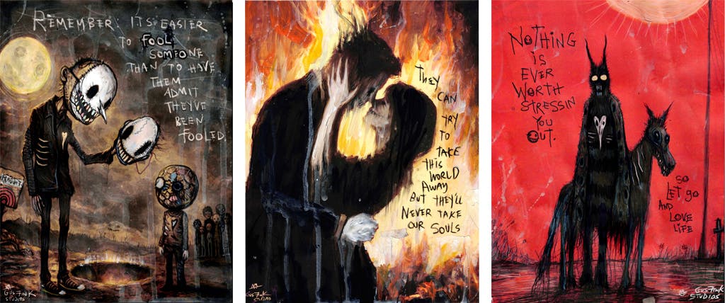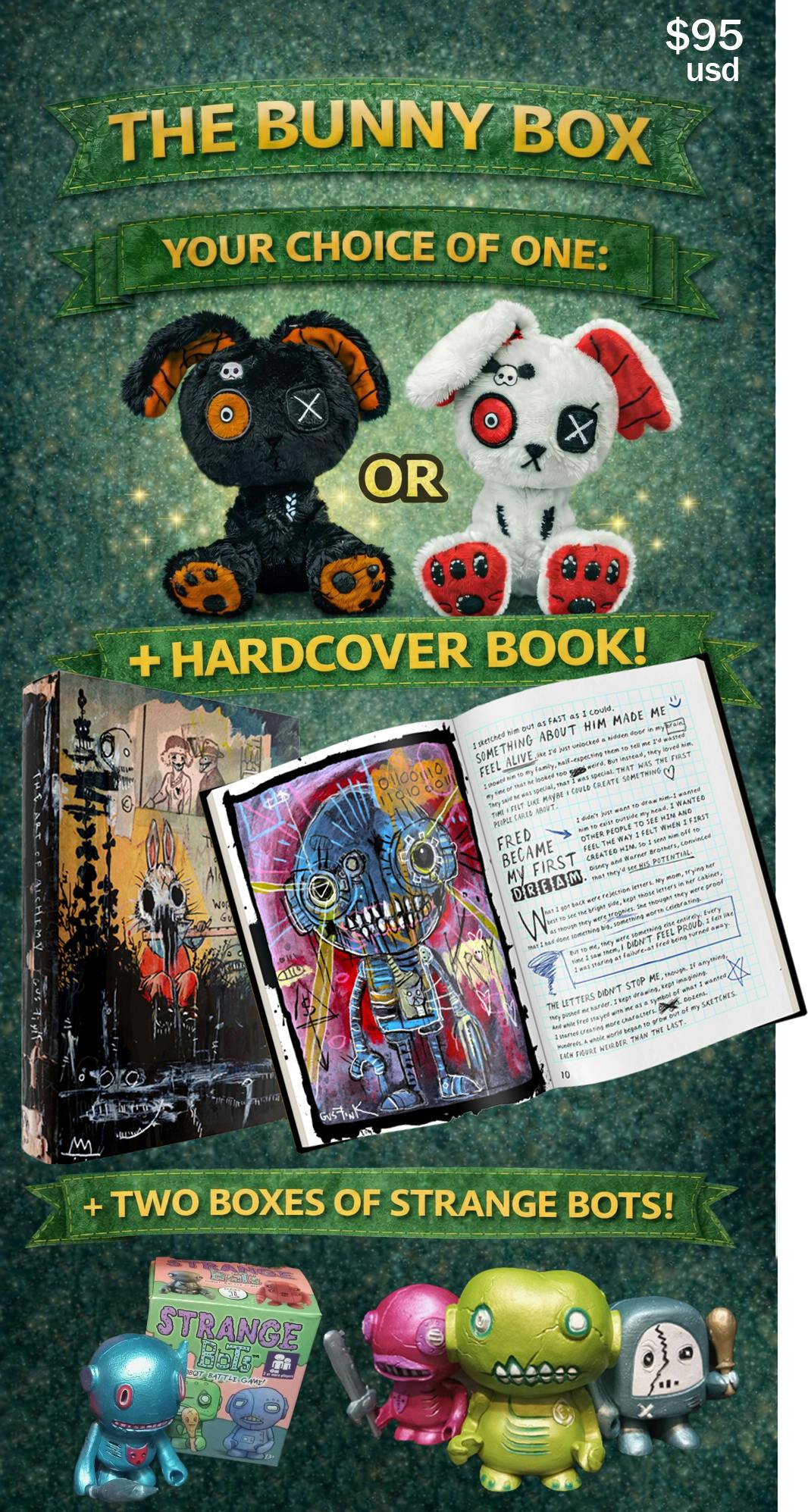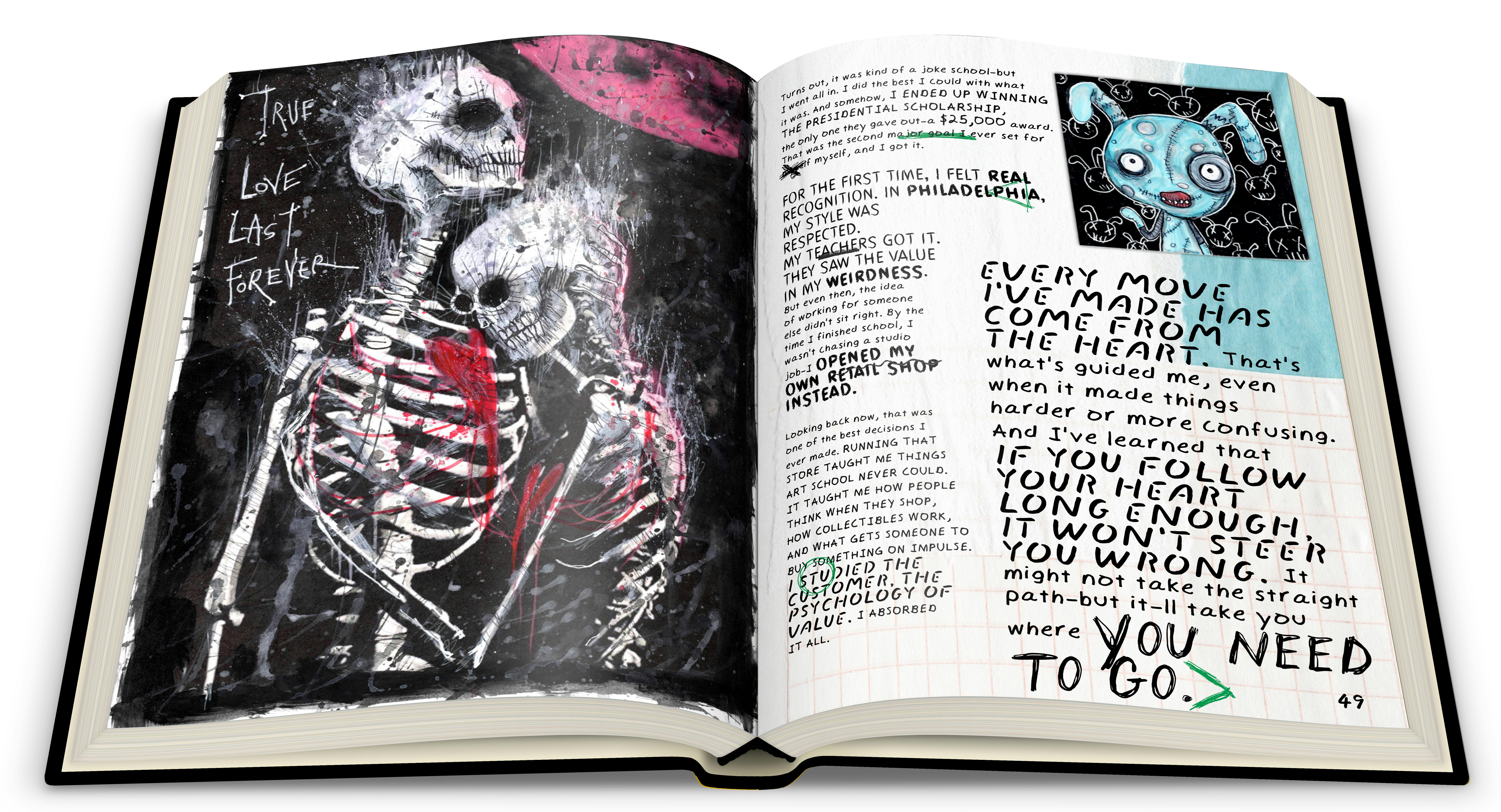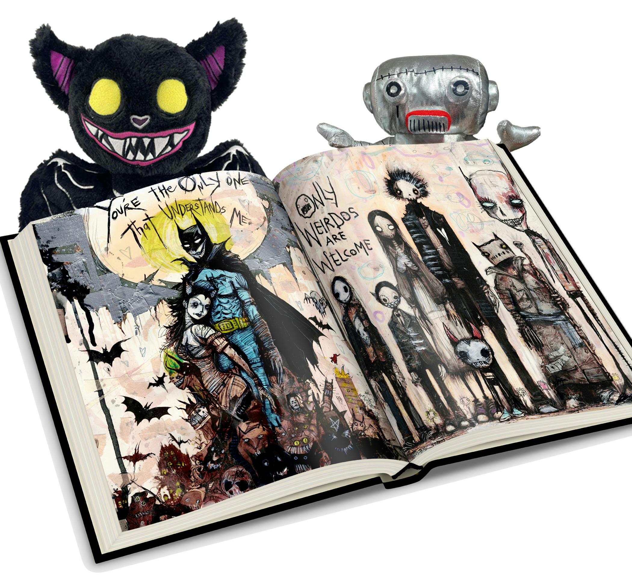Packed cover to cover with many of his most popular and beloved works, the book explores the full range of Gus’s prolific career — from paintings and drawings to video games, mixed media creations, and the strange cast of creatures that eventually became his cult-favorite plushies. It’s a dense visual archive of an artist whose work has carved out a truly unique space in contemporary dark art.