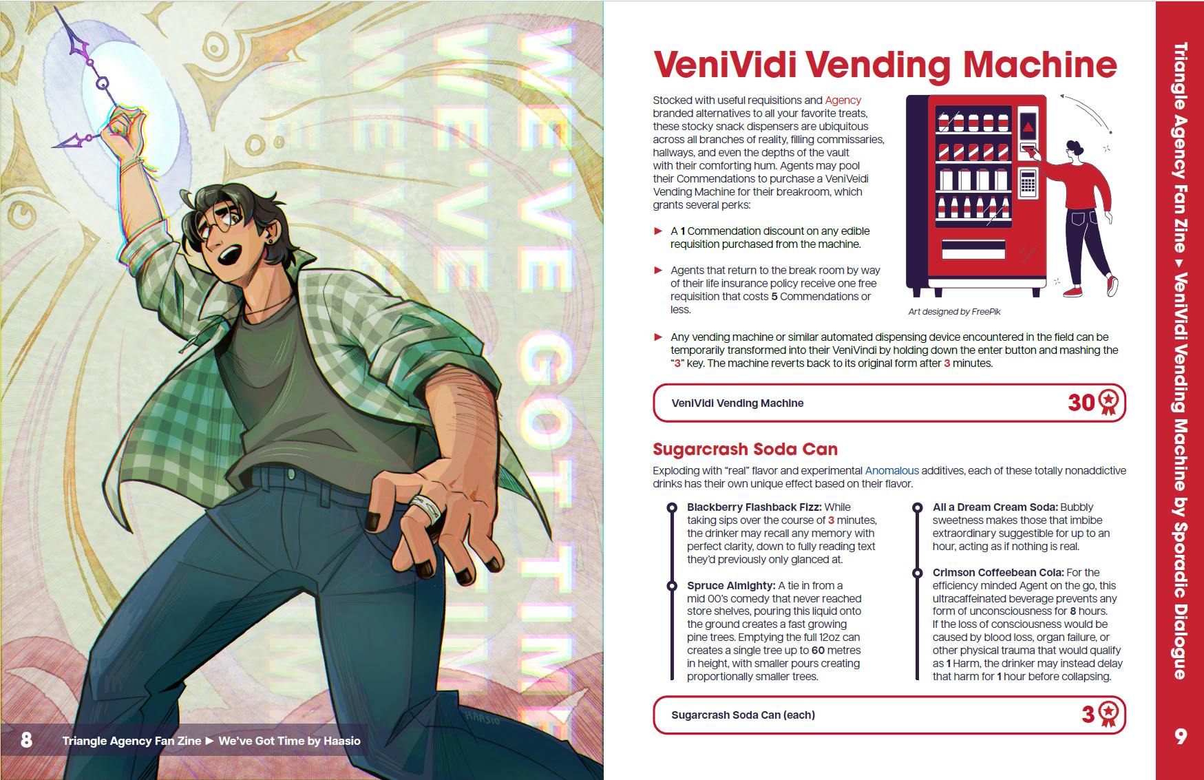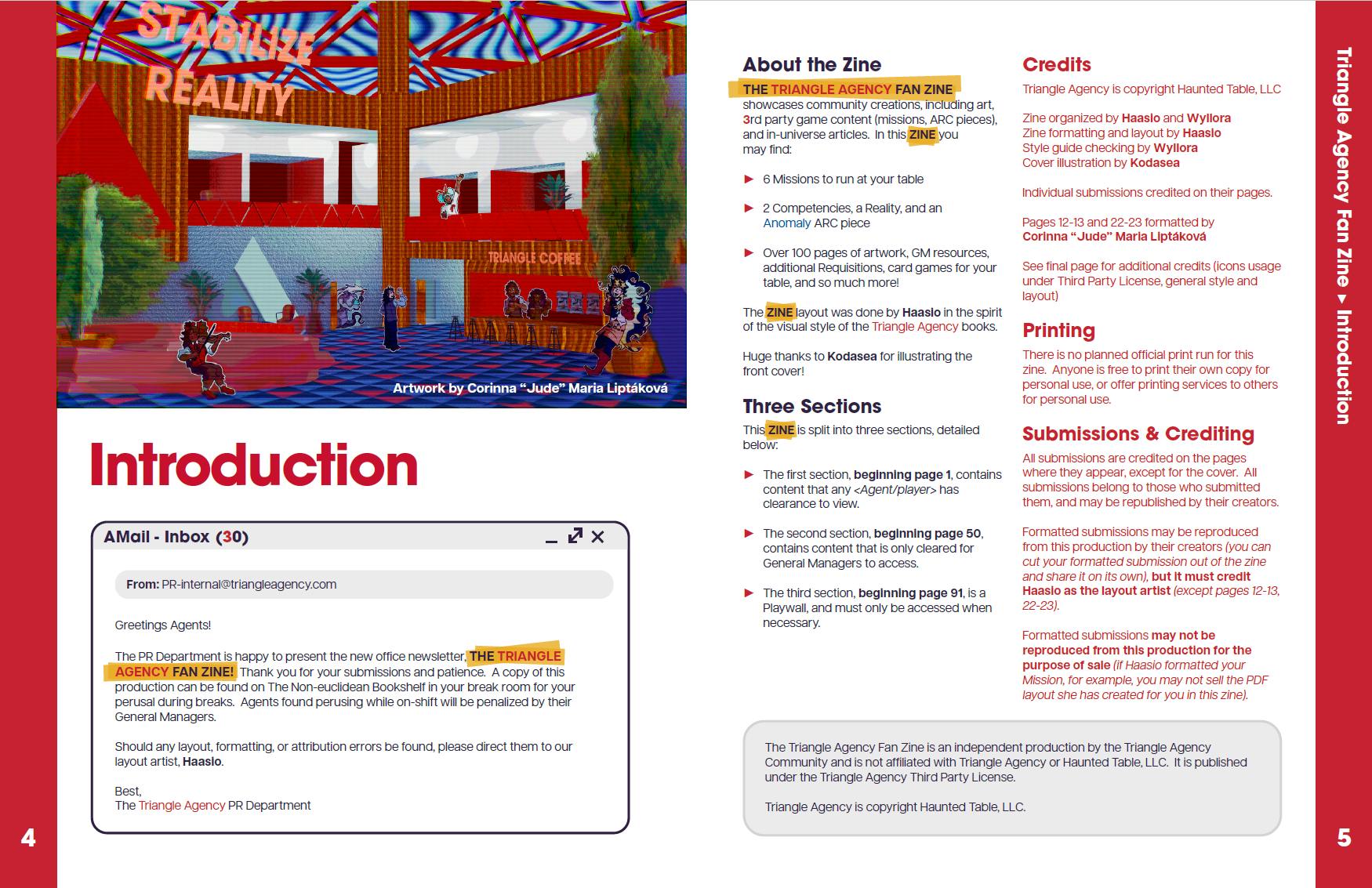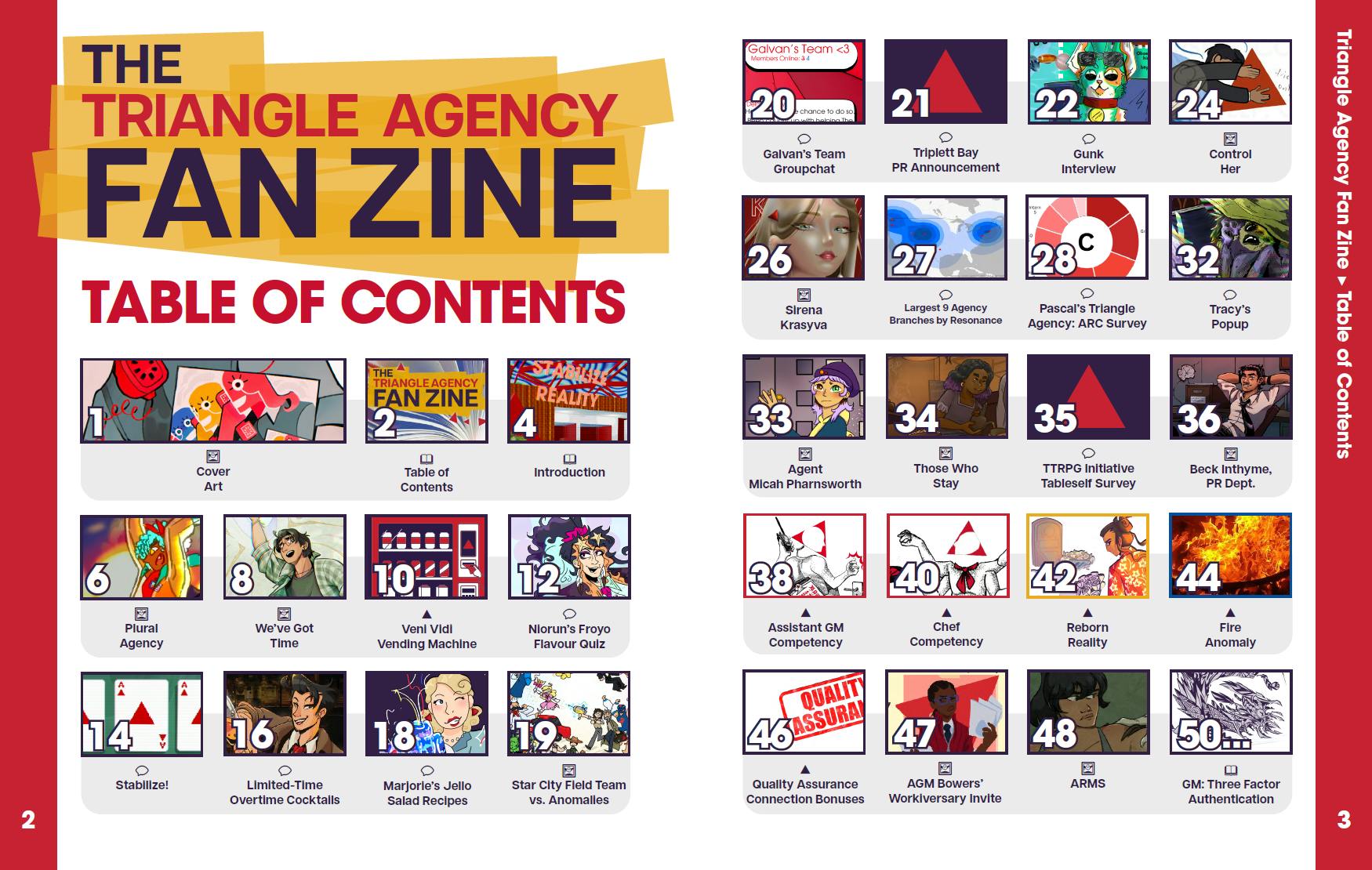 THE TRIANGLE AGENCY FAN ZINE showcases community creations, including art, 3rd party game content (missions, ARC pieces), and in-universe articles. In the current version of the zine, you may find: