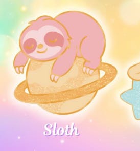 Next up we have Midnight Mica Art's Celestial Snuggles, and my favorite is the sloth! He's just so cute, look at him! And next to that is Mr. Weeples from Across Space by Visitors Media. I just want to know why he's so sad?? Why he cry?? Who hurt him??