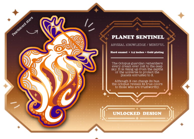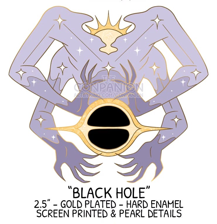 Last but most certainly not least, we have an absolutely stunning black hole design from Kino's ita bag campaign! I'm so into their whole aesthetic on their campaign and so happy for them with their massive success! And of course we can't forget one of my favorite pin artists, UltraInfinite! Their sundog plushie is sooo cute, but when it comes to pins, I really love the colors of the Throne pin and I'm excited to add it to my UltraInfinite collection!