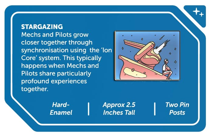 Next we have Mad Child Soul's Across the Galak-Sea! All their pins are so detailed and intricate with gorgeous colors, but I'm of course a sucker for tea, so the teacup is my favorite. Picking a favorite from Parable Games' Lo-Fi Mech Pins was also tough, but I just really liked the relaxing, peaceful vibe of the "Stargazing" pin.