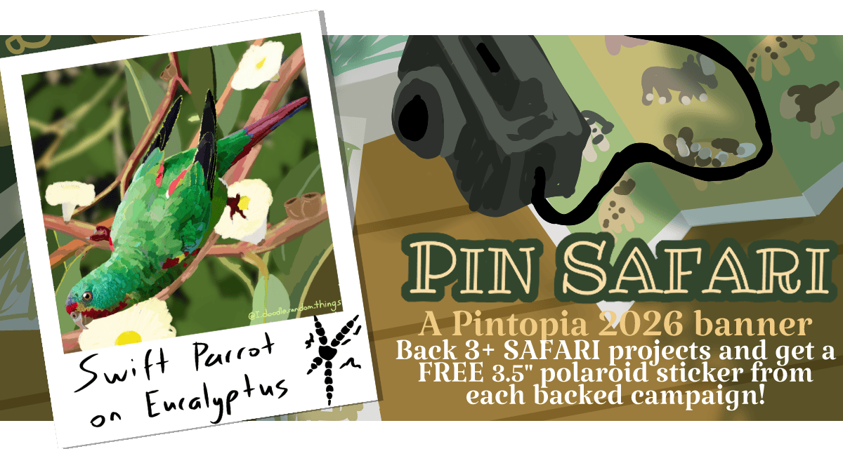 Get an exclusive polaroid sticker of a Swift Parrot climbing along a young eucalyptus tree, if you back 3+ projects under the Pin Safari Banner, all backed banners will send an additional free polaroid sticker!