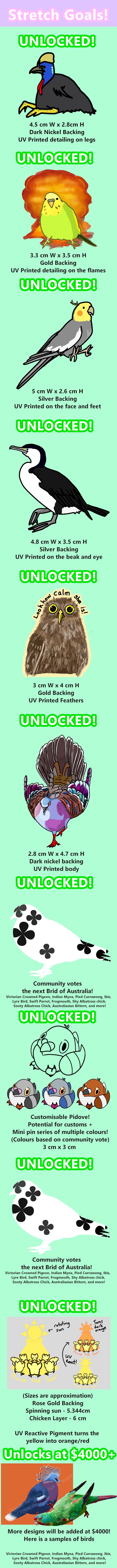 The primary goal is to raise funding back from Brids of Australia, but also to gain enough funding for some new pins! To incentivize further, stretch goals for Brids of Australia will be reduced to $100 per tier