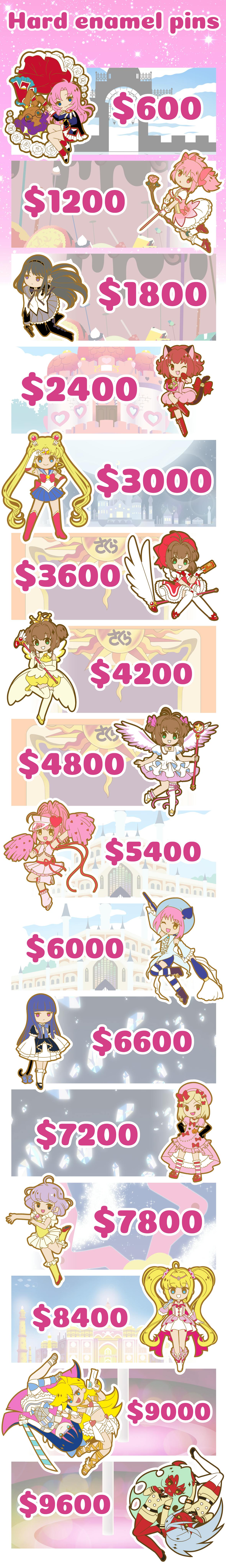 Prices are discounted for the campaign. While the pins will sell for $15 on average normally, the base price for backers is $12. Early bird discounts are $10 each in their respective tiers! All leftovers will be available in my shop after all rewards are distributed.