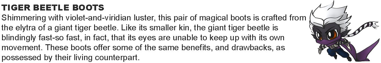 $10000 pledged - STATUS: UNLOCKED At $10000, every backer from reward levels $5 and up will receive a PDF for 5E/DCC rules for the Tiger Beetle Boots magic item written by Bob Brinkman. "Gotta go Fast, Gotta Go Fast, Faster, Faster, Faster" - words heard from Galak Starscraper while running from certain death