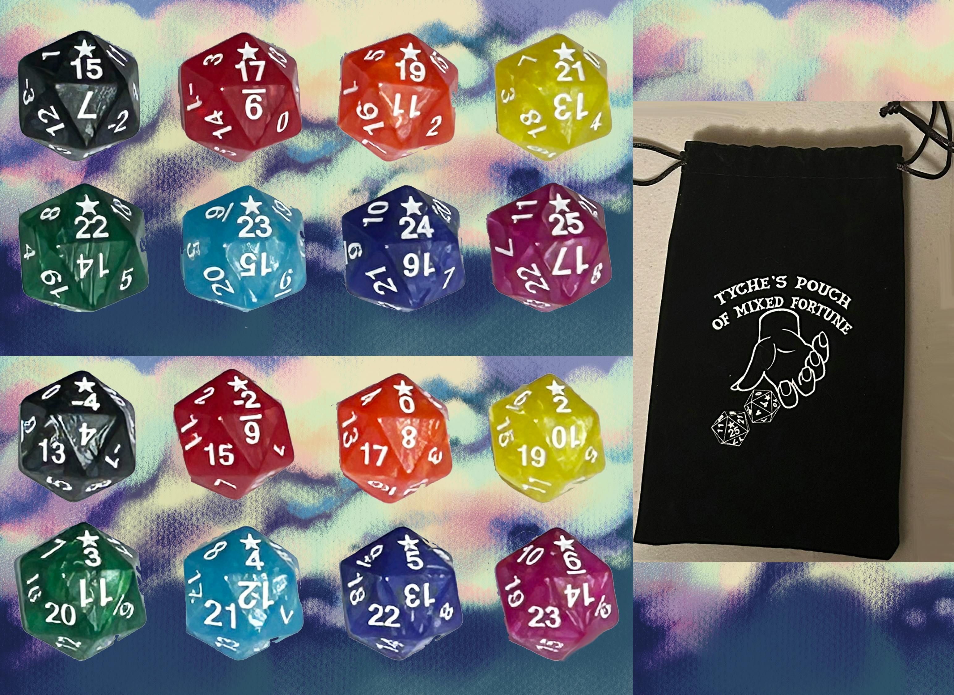 This pouch contains 8 pre-modified d20s in colors matching Tyche's Pouch replacing the normal d20 and showing the Tyche's modifier roll. The stars on the d20s represent the highest and lowest rolls in case the GM wants to restrict crticial successes and failures to a 1 in 20 chance vs the larger range these dice will offer.