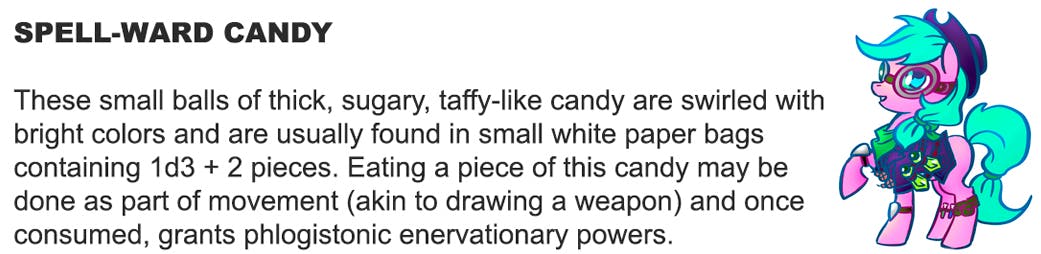 $5000 pledged - STATUS: UNLOCKED At $5000, every backer from reward levels $5 and up will receive a PDF for 5E/DCC rules for the Spell-ward Candy magic item written by Bob Brinkman. "Who knew magic missiles were allergic to taffy" - Galak Starscraper