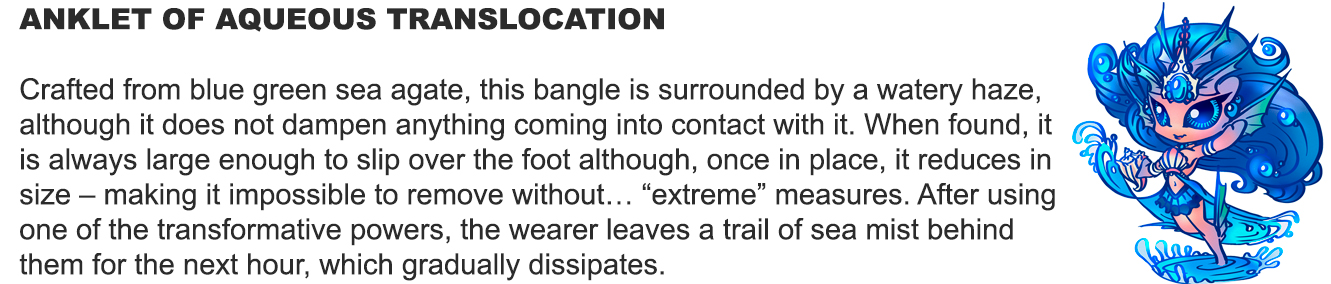 At $20000, every backer from reward levels $5 and up will receive a PDF for 5e/DCC for the magic item the Anklet of Aqueous Translocation "I mean its a great bit of jewelry if you really don't mind getting wet to get where you really want to go." - Galak Starscraper