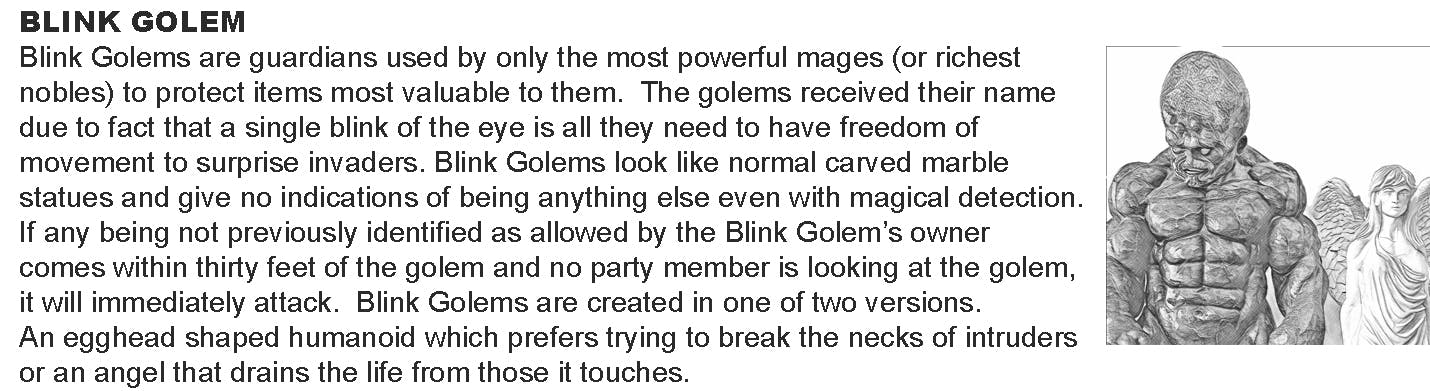 At $15000, every backer from reward levels $5 and up will receive a PDF for 5e/DCC for the new monster, the Blink Golem. "Don't blink. Don't even blink. Blink and you're dead. They are fast. Faster than you can believe. Don't turn your back. Don't look away. And most of all, don't blink. Good luck" - Some Cleric? shouting at Galak Starscraper through a scrying portal