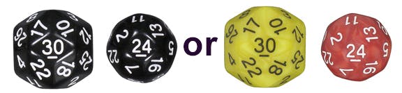 In addition, if want to fill out your Laverna's Ring D3 to D22 with a D24 and D30 so you have a full DCC 14 dice set as part of that dice set, they are offered for the reduced price of $4. Available in Black or Multi-Color.