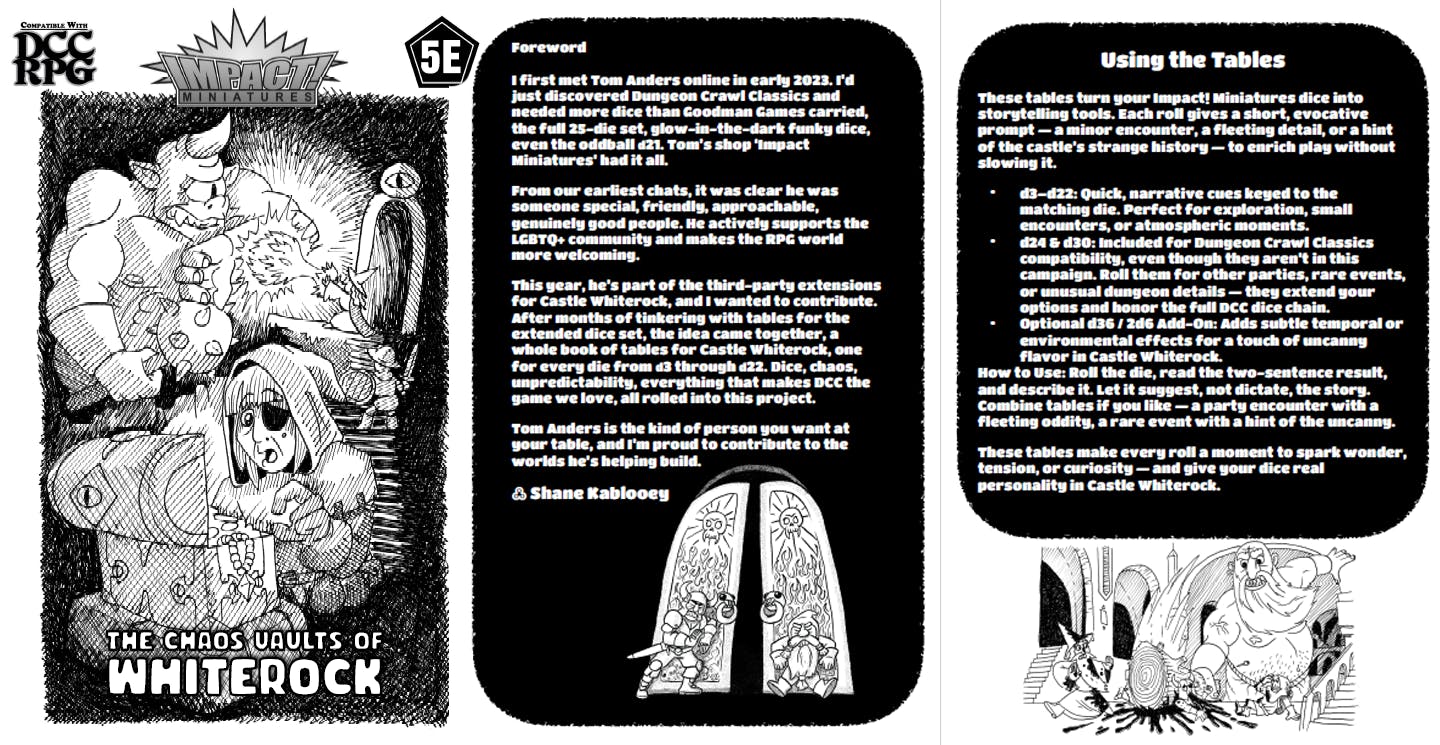 11 sets of Impact!'s DCC 14 dice sets are offered as Add-ons. Each has been discounted to $20 and each set will come will include a PDF for new content for both 5E and DCC.