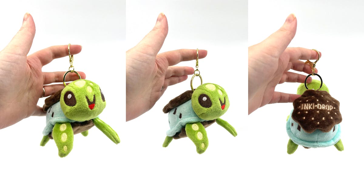 Photos of Mint Chocoturtle showing keychain placement. Final hardware color or shape may change.
