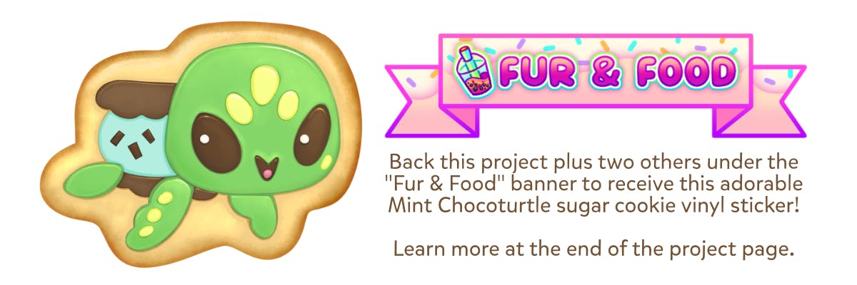 Back 3+ projects (this project plus two others) under the Fur & Food banner and receive this adorable vinyl sticker I designed of Mint Chocoturtle as a sugar cookie! Tap/click the graphic below to be taken to the collective.