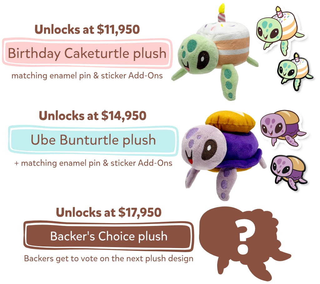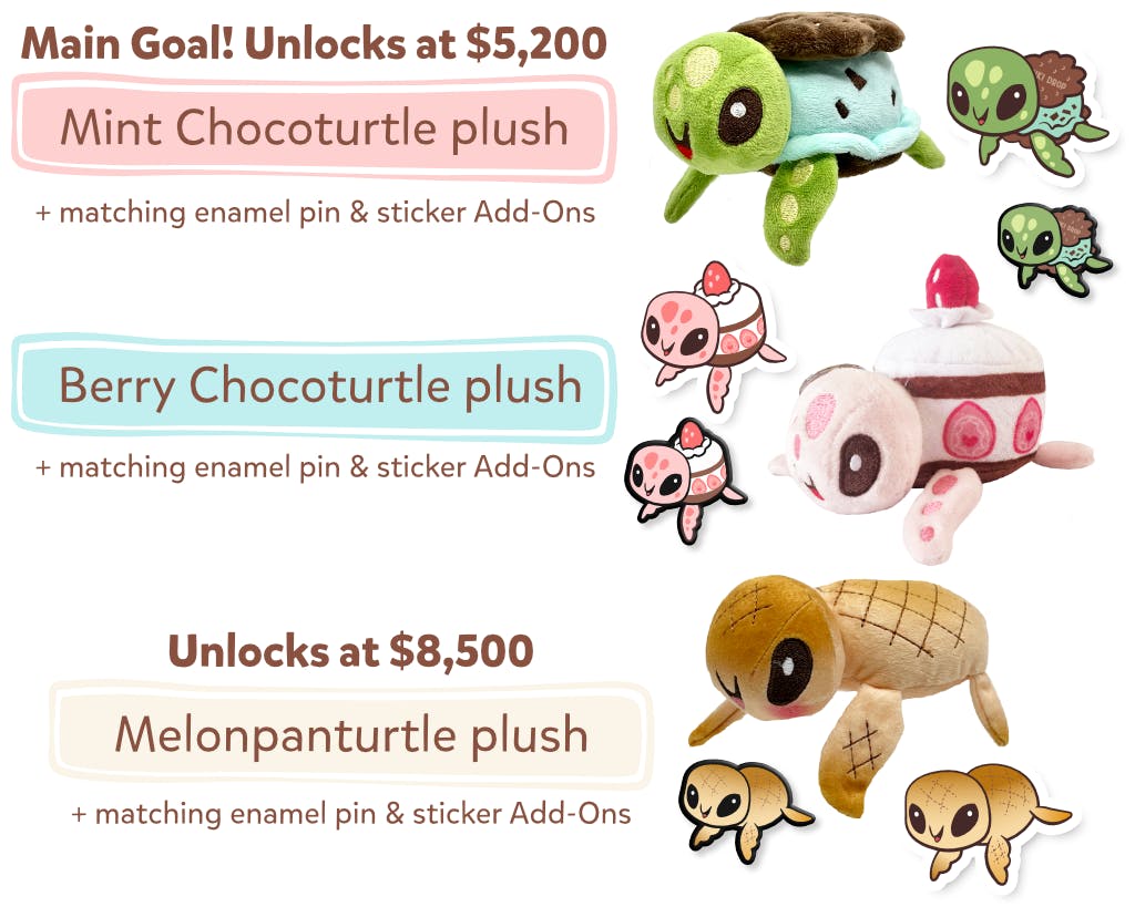 The main goal for this project unlocks the Mint Chocoturtle keychain pendant plush as well as a handful of cute enamel pin designs. The initial goal amount covers the cost of prototyping, product safety testing, packaging, freight shipment and tariffs from China to the US/EU, plus BackerKit fees.