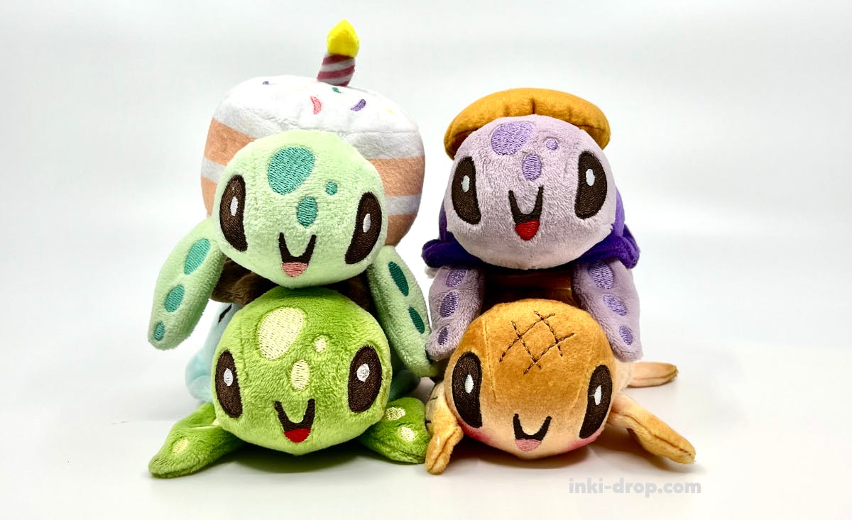 Each little turtle plush measures 13cm/5"in long from their cute little faces to their back flippers. Height is variable based on design, with Birthday Caketurtle being the "tallest" because of her candle.