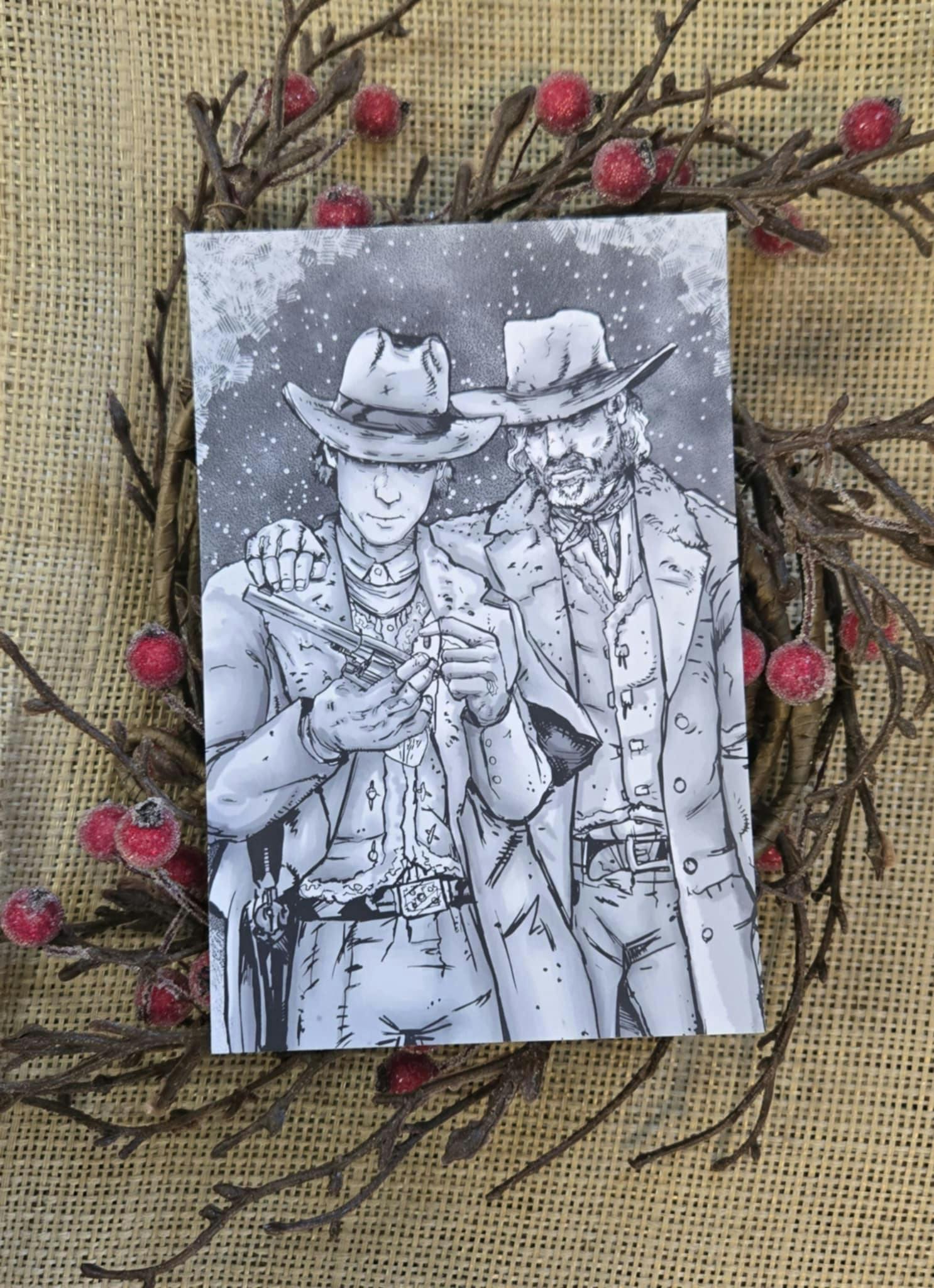 This postcard features 16-year-old Van and his infamous father's old friend - the equally as infamous Holt Haggerty - during Van's first Christmas as an outlaw. This original art was created by artist Wilkolence as the illustration for the short story Outlaw Christmas (also found in the Add-on section!), but has now been rendered as a beautiful, high-quality, physical holiday postcard collectible!