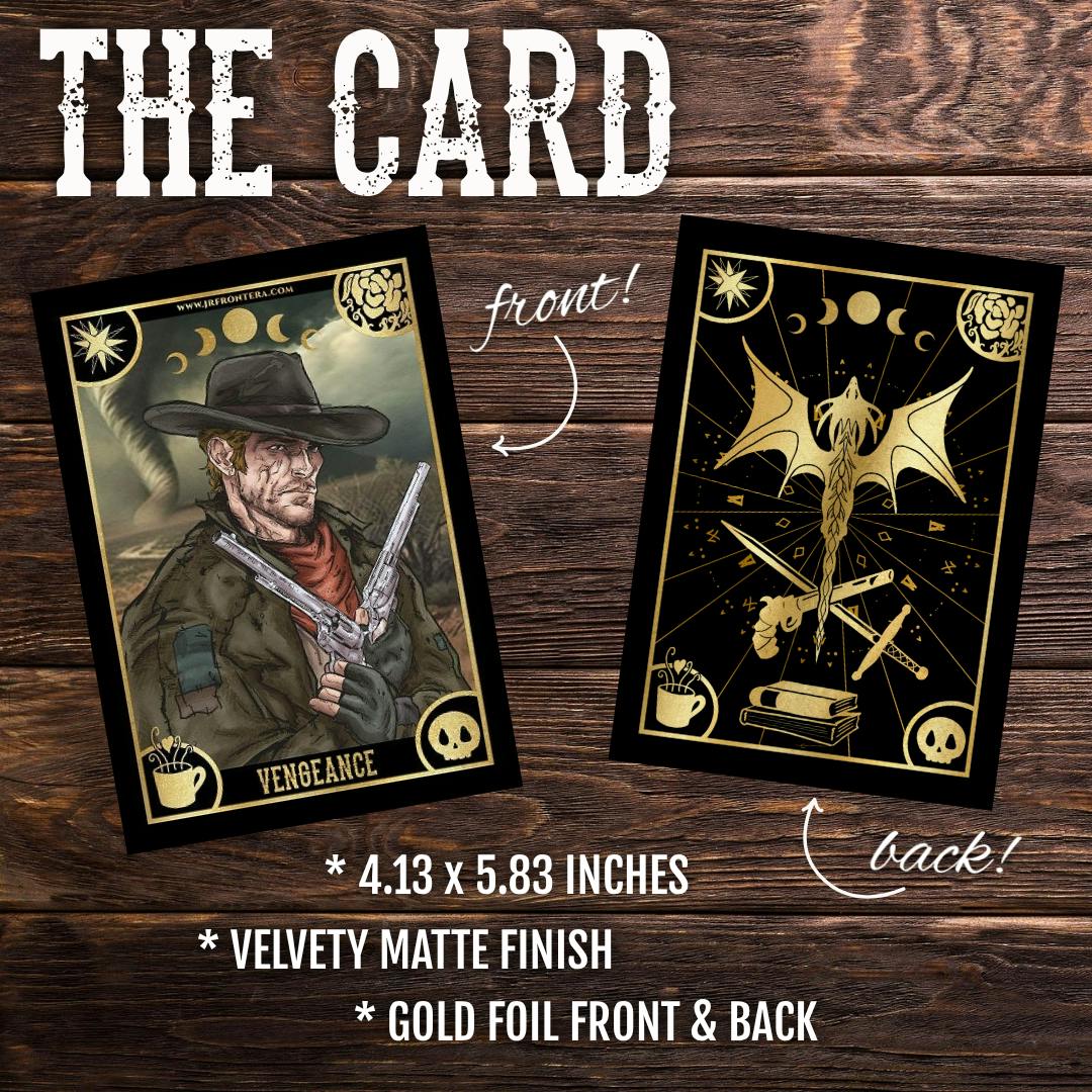 This physical 4.13x5.83" card is one card in the Storytellers Oracle Deck and features The Legacy of Lucky Logan's main character Van Delano as VENGEANCE!