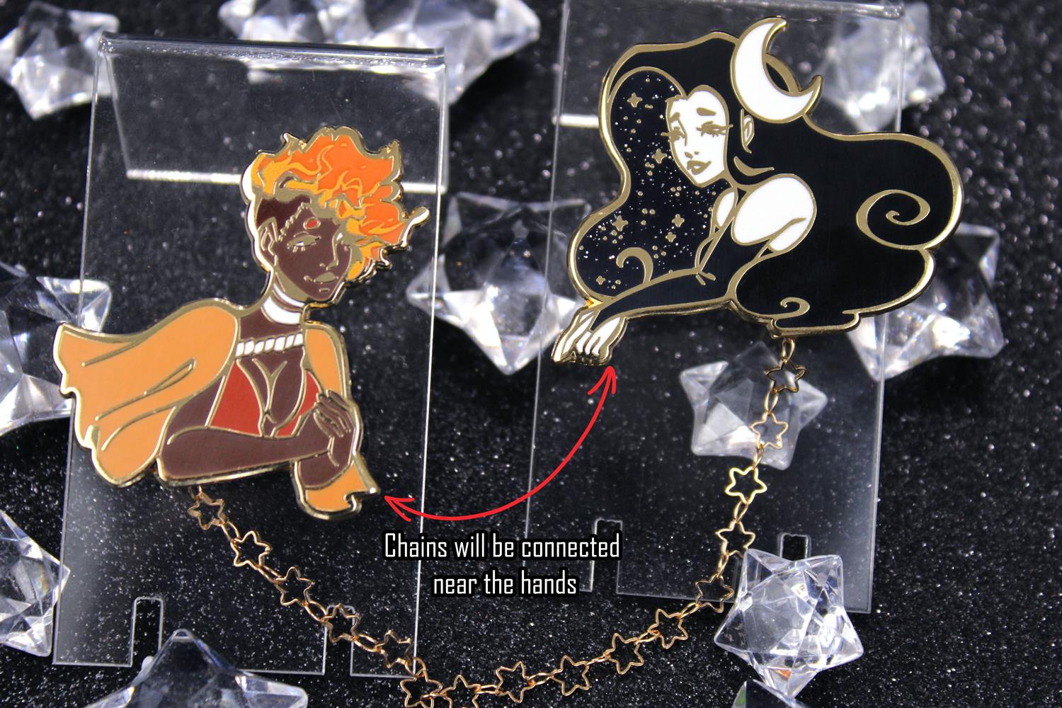Lets talk about the photos. Sun and moon had two issues being: 1. Sun had white where she wasn't supposed to and that will be fixed. 2. the chain is fixed in the wrong position and will be in the correct position for the final pins. Here's the samples I have so far pre-fixes.