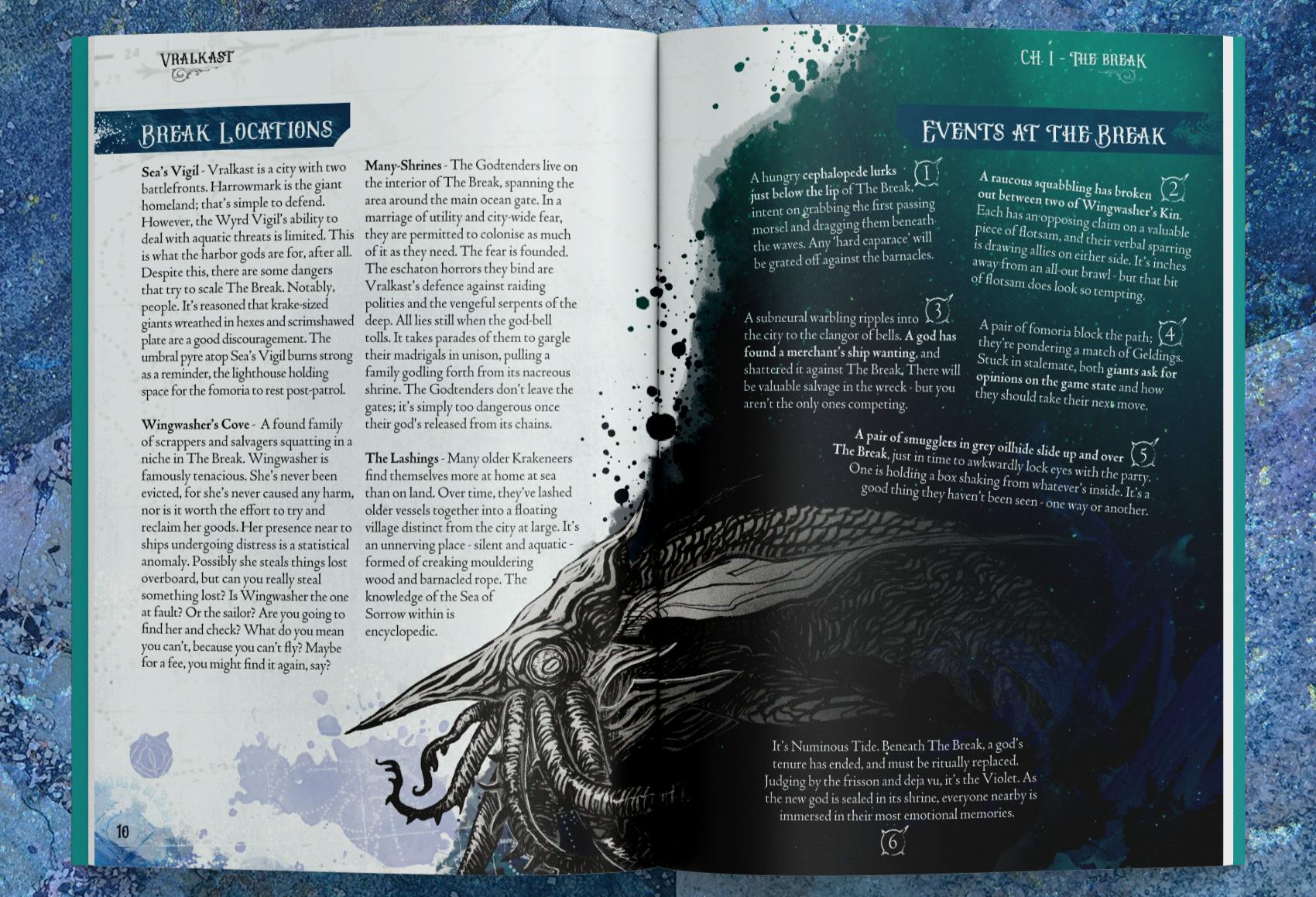 Vralkast is a system-neutral city setting - a vertical port built into the sea cliffs of an endless underground ocean by giant hands, populated by monsters of all kinds. Beneath the starworms, city life is a raucous cavalcade of clashing factions.