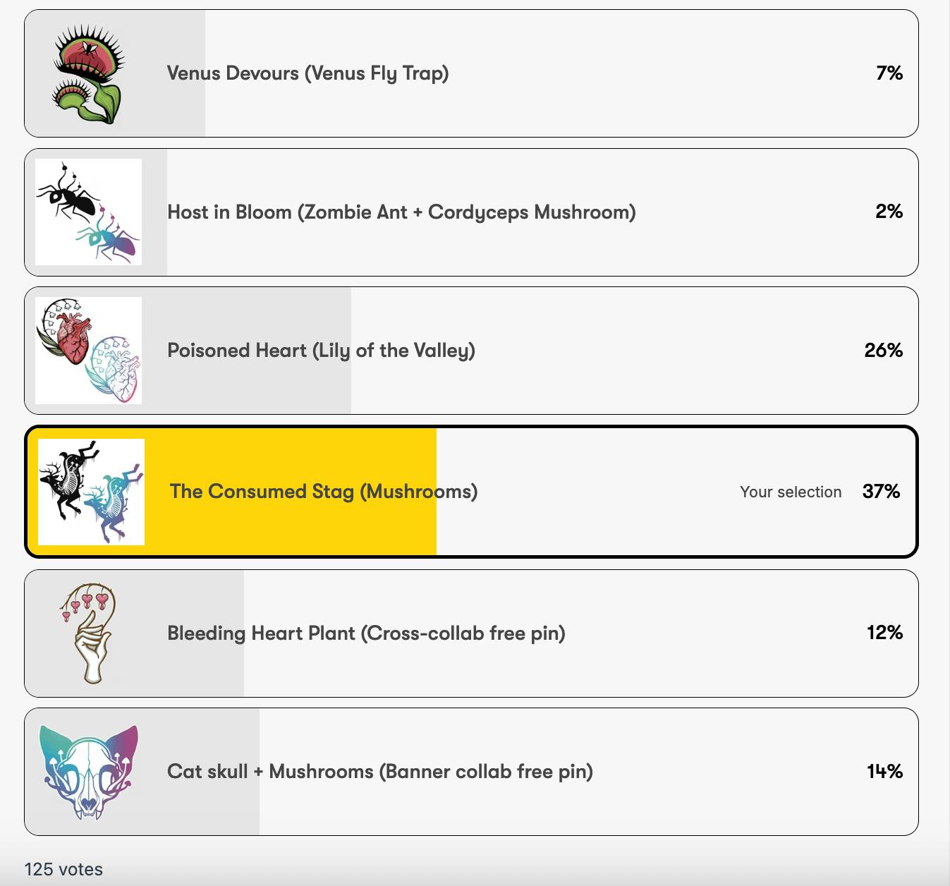 I've been working hard to make new stretch goal designs!! Now's the time where you get to help determine which two pins automatically unlock in the new Community Poll here~ 🔓🎉