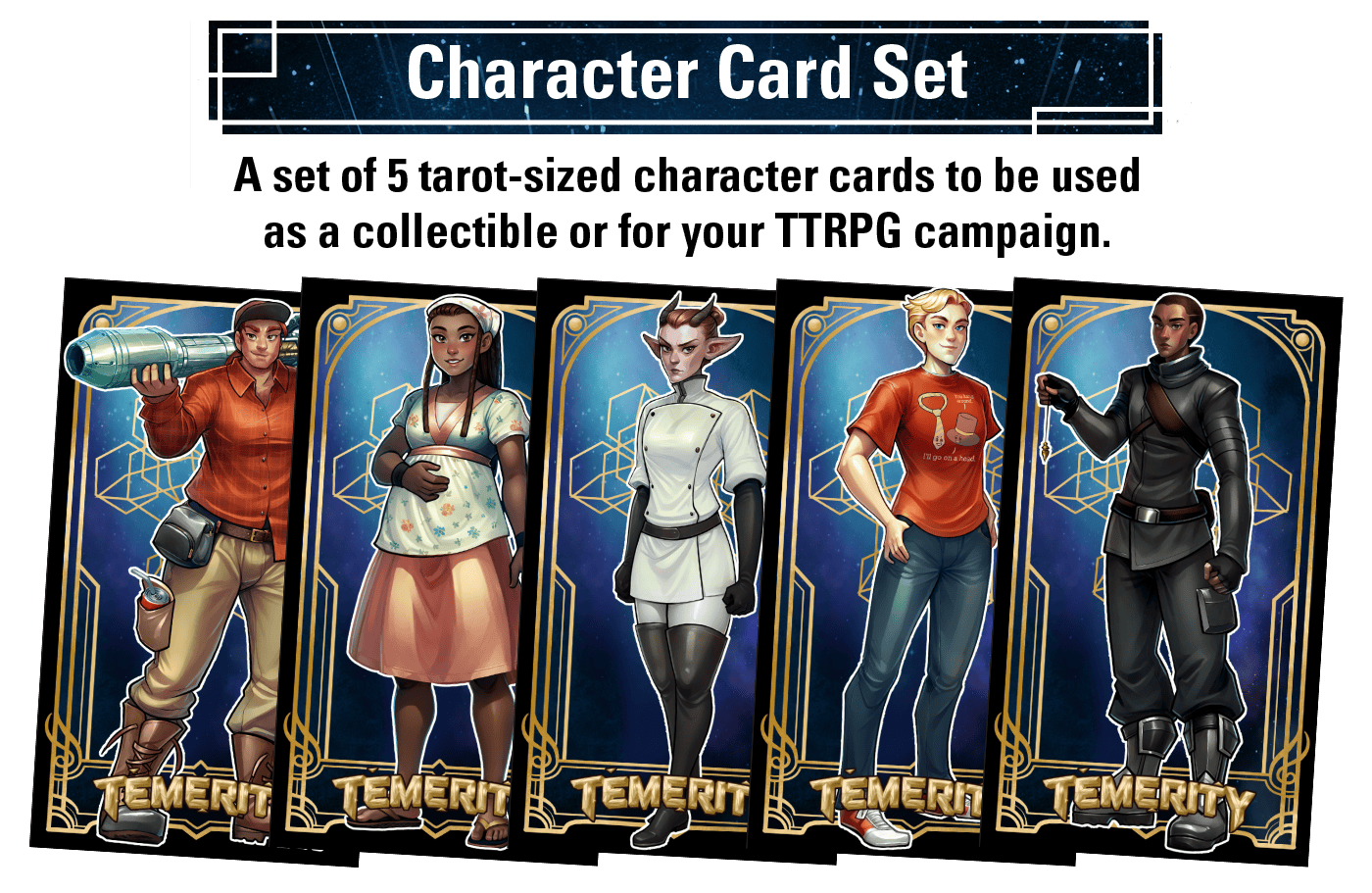 These tarot sized character cards are perfect for your table-top adventure! These cards can be used as player characters, NPCs, or whatever you need in your game. Each card comes with an art-only front with character traits and background information on the back.
