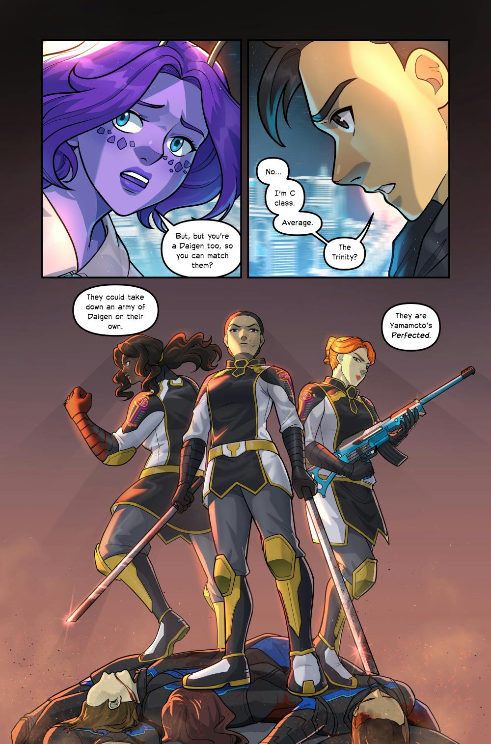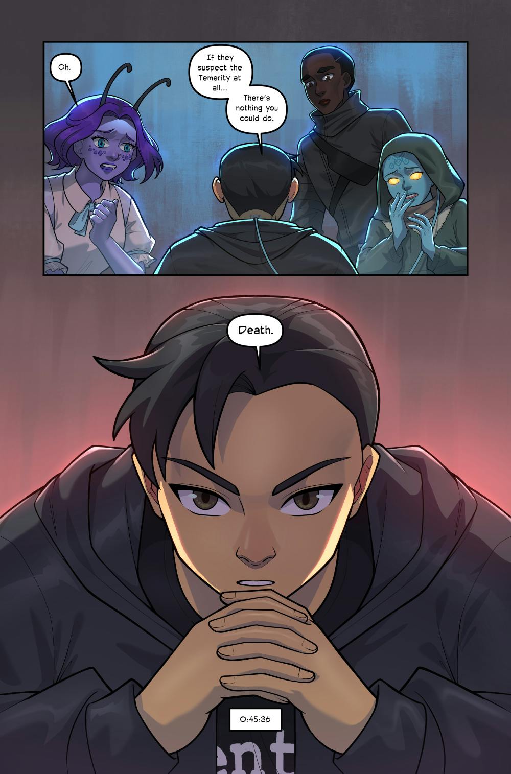 Temerity is rated teen for violence and some darker themes. This comic does NOT contain swearing, nudity, excessive gore, or toxic romance.