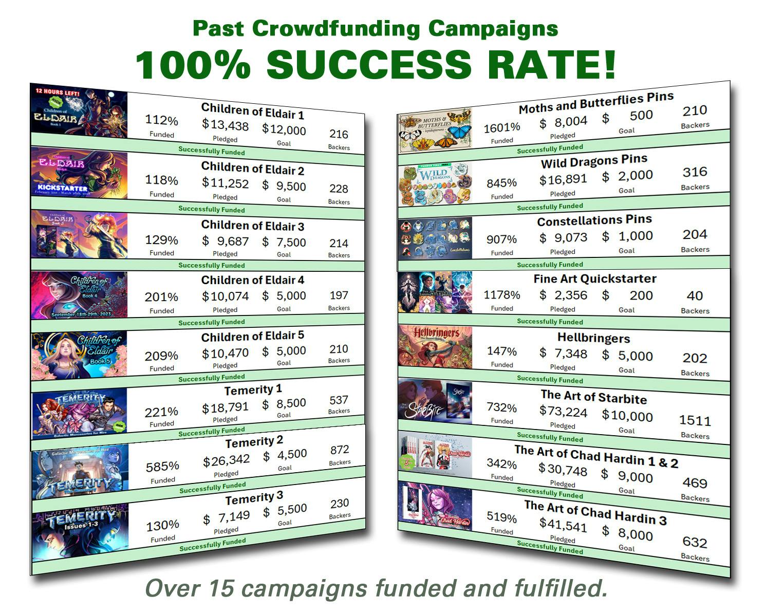 Backing a crowdfunding campaign is an act of trust, and I don't take that lightly. I've run and fulfilled 15 campaigns including this very series, where over 800 backers helped raise over $25,000 for issue #2 alone. My webcomic Children of Eldair has been running for over 10 years with 150,000 subscribers and 600+ pages of content. I know how to deliver. When you back Temerity, you'll get your reward! On time, high quality, no excuses.