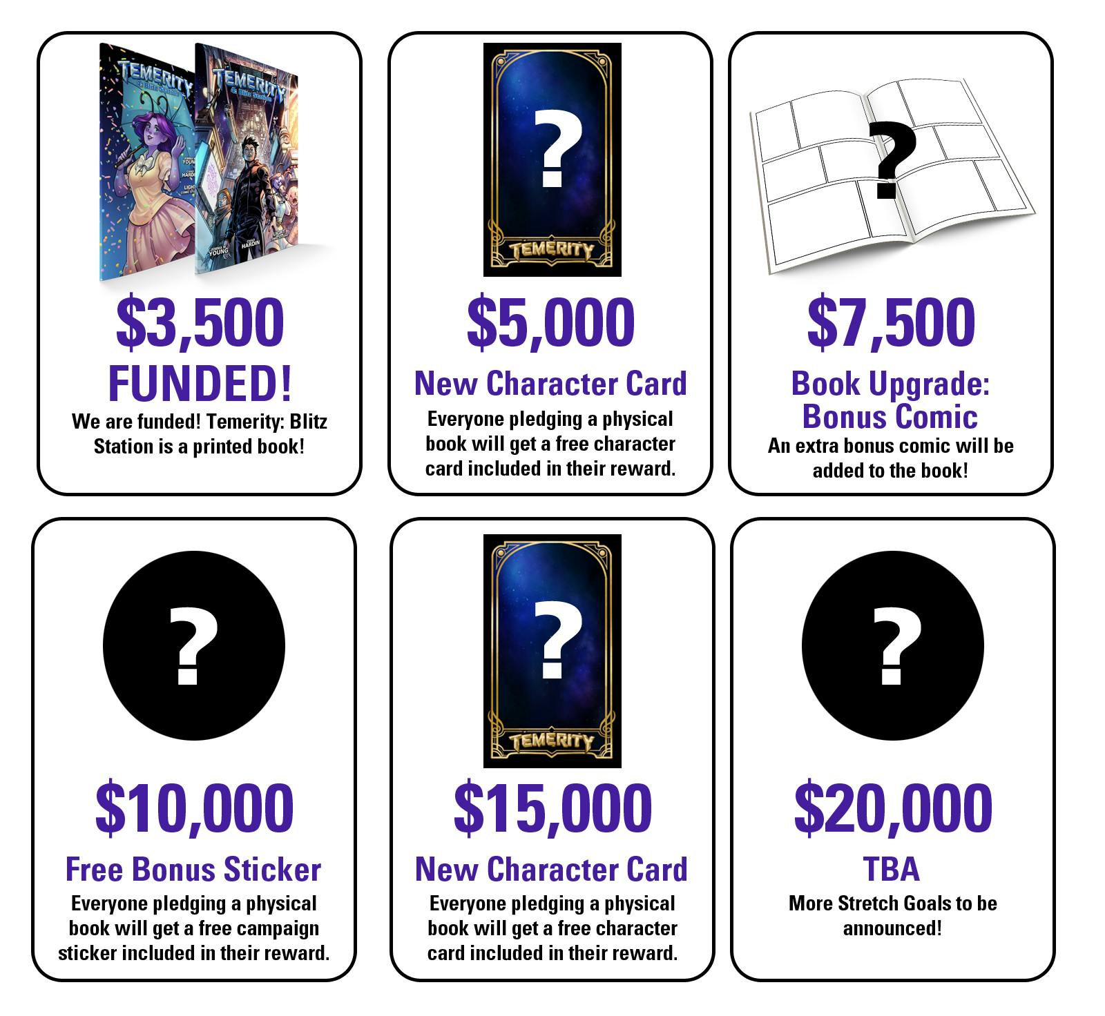 For our first stretch goal, everyone pledging a physical reward will get a free character card included with their book! At our next goal, a bonus comic will be added to the book.
