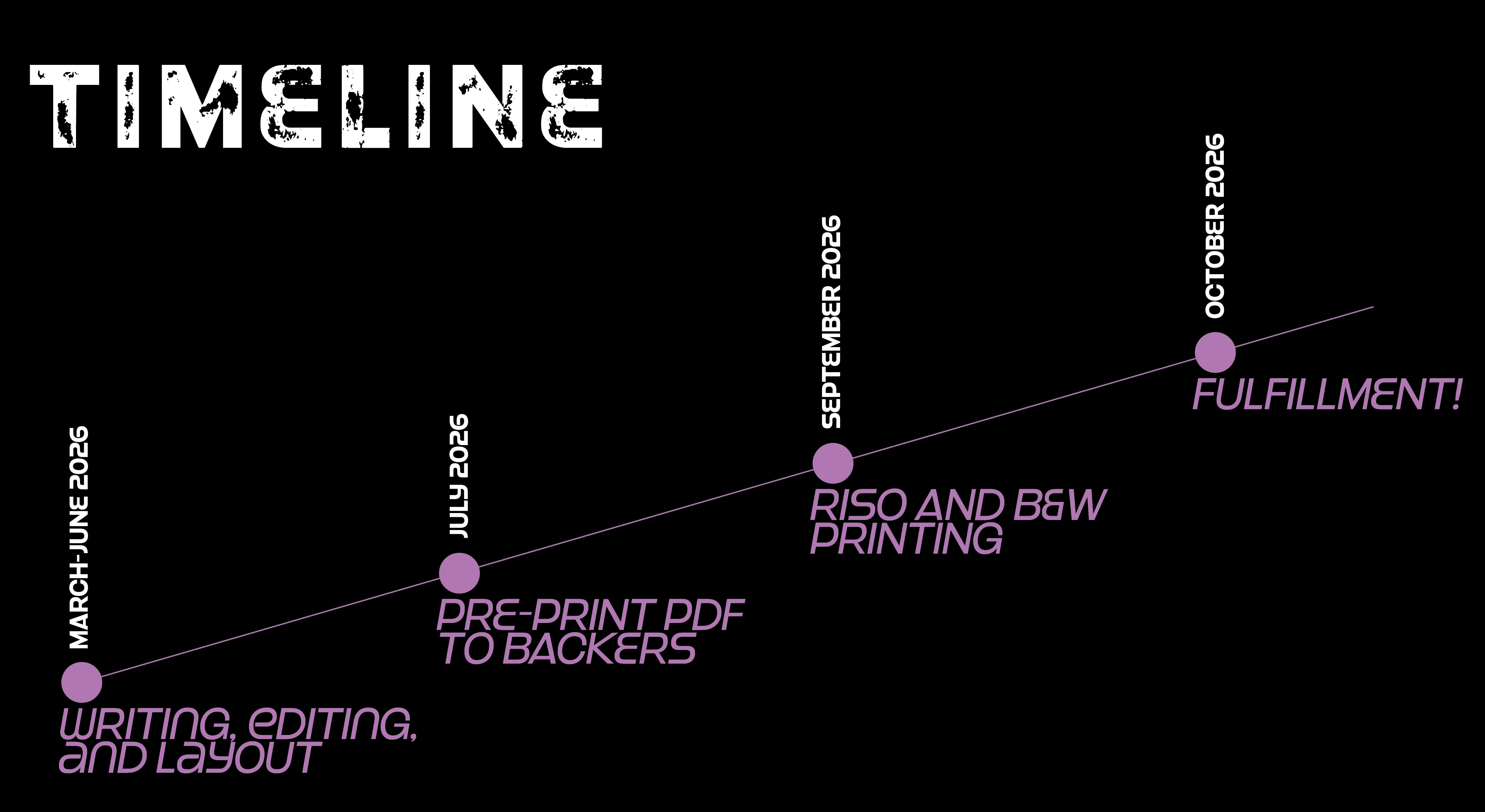 This timeline is super generous to allow for any issues that may arise. As the zine is 75% written, I expect to fulfill sooner than September. Regular updates will go out on a monthly basis to keep backers in the loop.