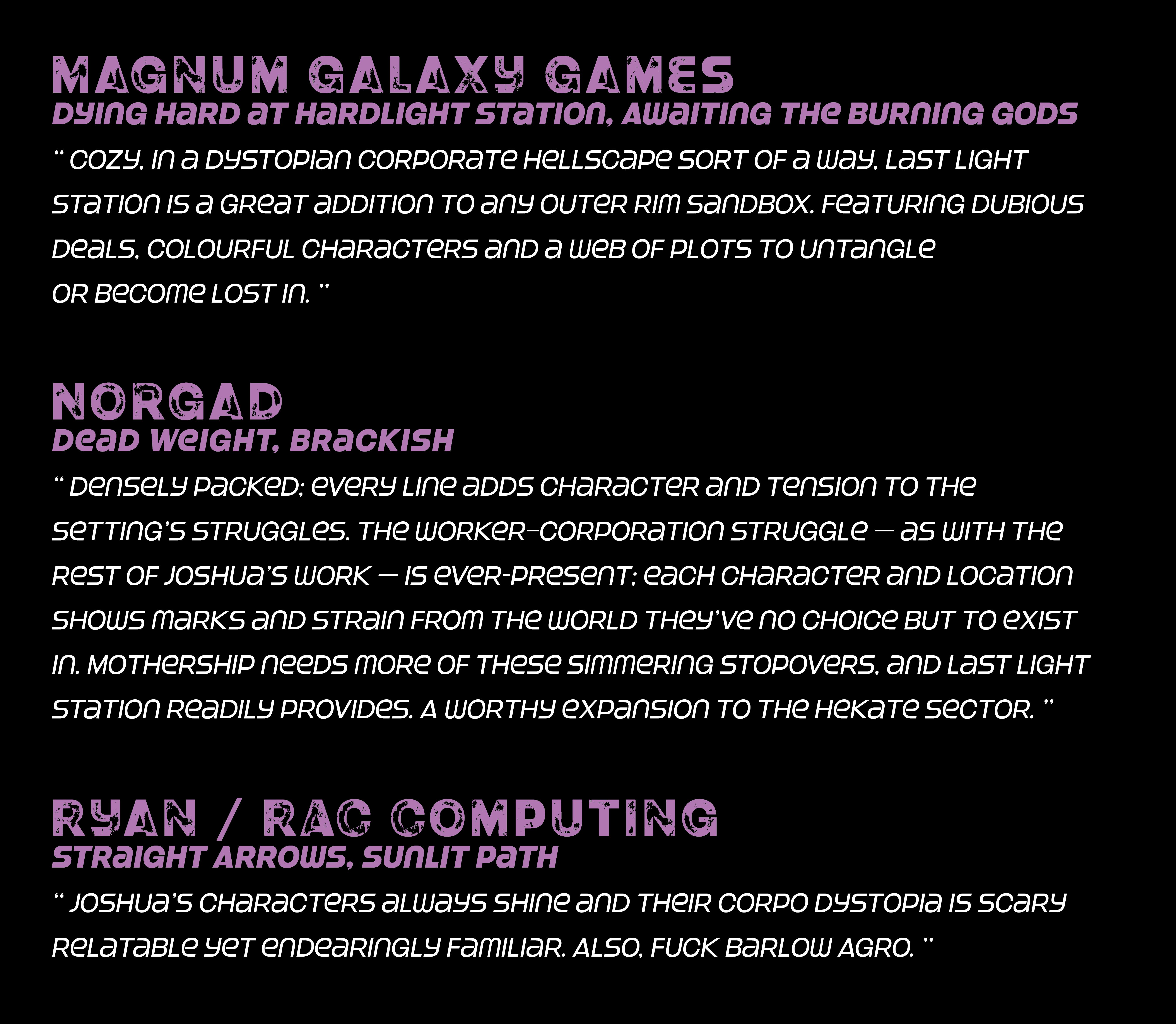 At the end of the only jump lane into the Hekate Sector sits LAST LIGHT STATION. Criminals, Corpos and those just trying to eke out a living fill the crowded space station. Whether your Crew need a place to recover, a base of operations, or just to lighten their pockets of some credits, Last Light Station is the place to be.