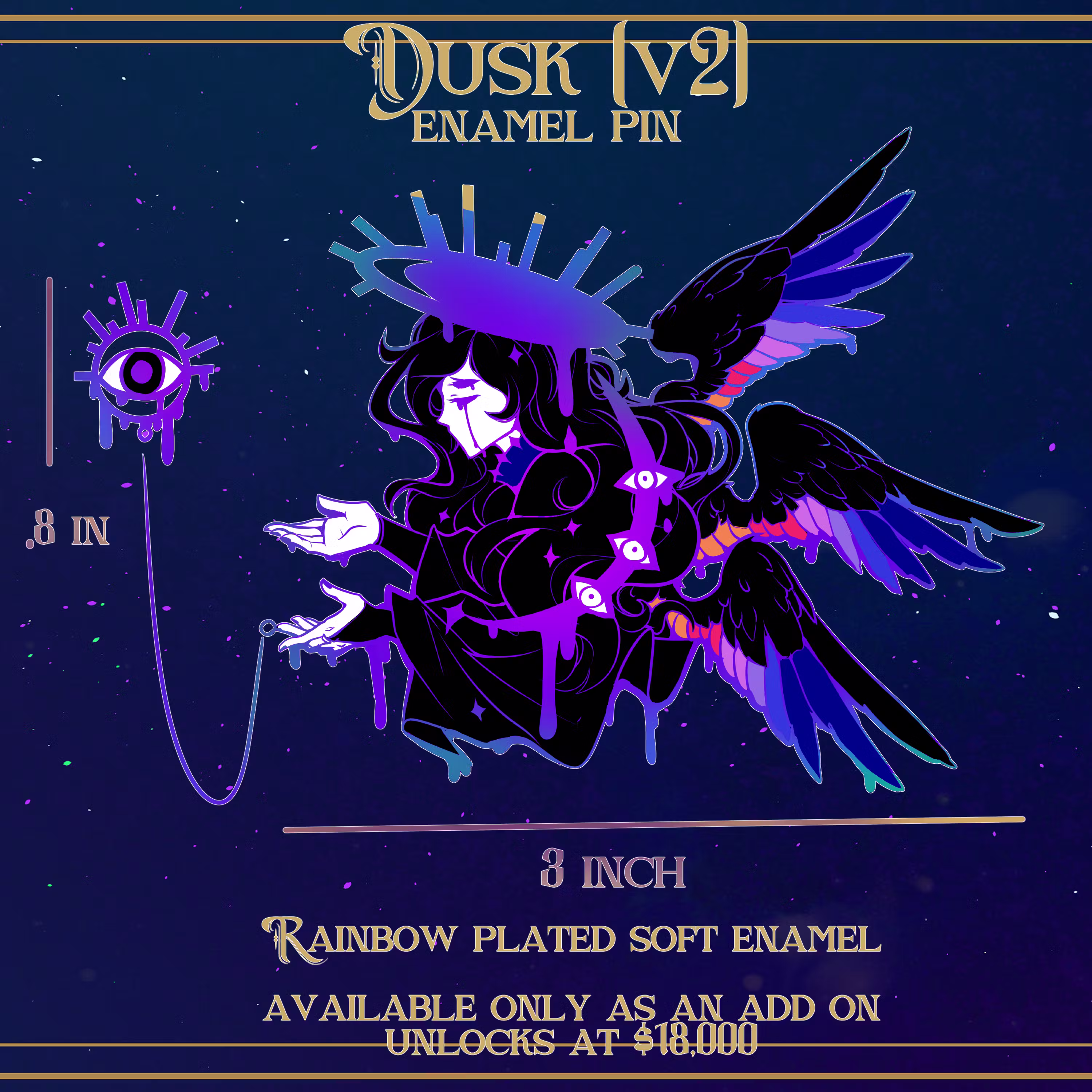 Unlocking at 18,000. Dusk (version 2)! A large 3-inch, linked, rainbow-plated soft enamel pin. This will ONLY be available as an add-on for $25 and will not come with any pre-existing pledges. Available as an add-on right now if you'd like to help fund it! A redesign of a pin I did for one of Jaizure's old campaigns that I've been meaning to get redone and this is the perfect opportunity!