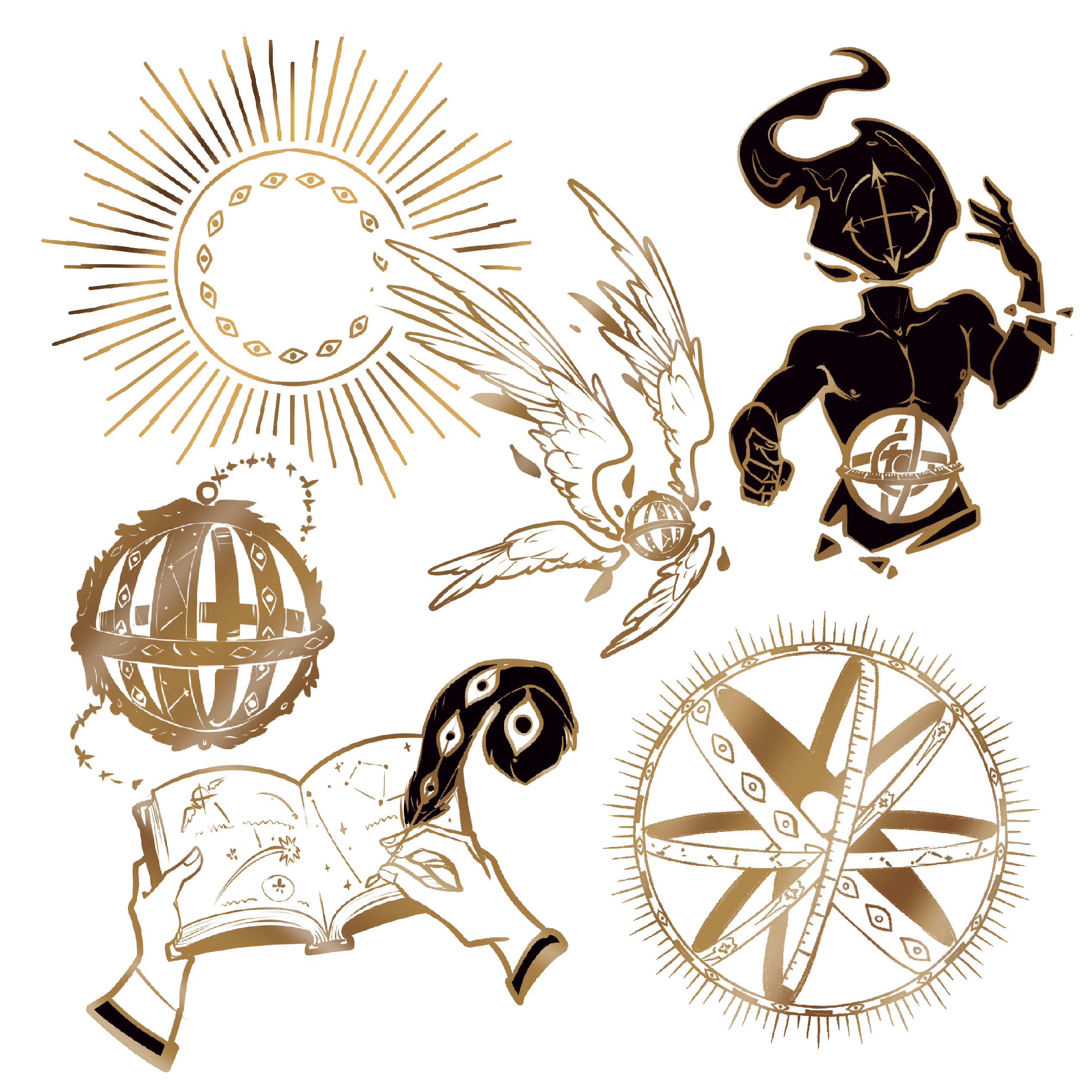 The Angelus Astronomica pin collection will be all hard enamel, matte gold pins with a limited color palette. (Current designs are a mockup and may be changed slightly for production)