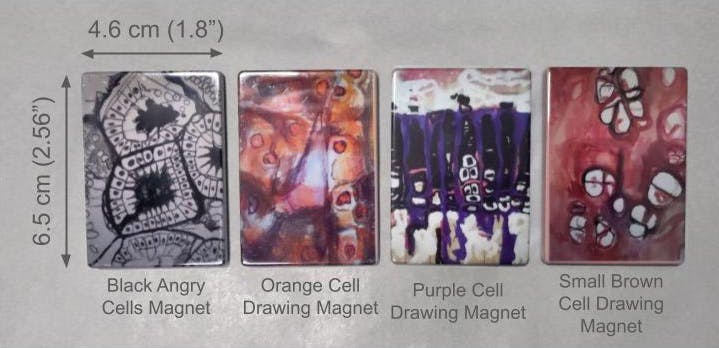 Art and Science are one in the same for me. I made paintings inspired by microscopy images in biology textbooks in my first year of Art School. Four of these Cell Paintings are featured on rectangle magnets here - I call these the original Art School paintings.