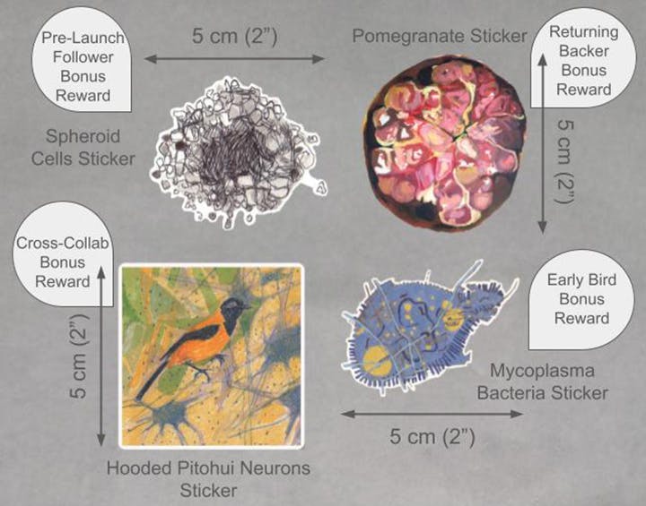 Thirdly, returning backers from my previous campaign, Drawn to Cells? Curious Magnets, will receive a free Pomegranate Sticker! This sticker features a painting I made at Art School, around the same time as my original Cell Paintings, when I was exploring similar shapes all around me.
