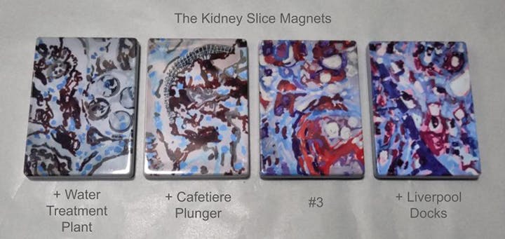 Each painting is inspired by an image of a kidney that might be used by a doctor to diagnose disease, with the addition of a feature that tells more about the kidney.