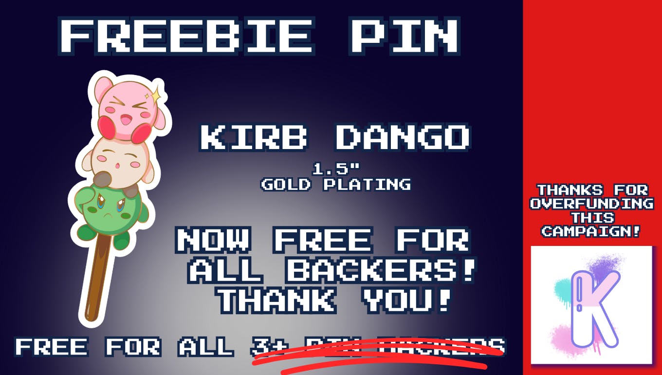 A free Kirby Dango Pin for all 3+ Pin Backers! SIKE! Since you all have overfunded this campaign, I'm making the Kirby Dango Pin FREE for EVERY SINGLE BACKER! Consider it a thank you for how much I've accomplished since becoming a pin creator! Please do note that backers to the tip jar/creator support tier will not be eligible for this freebie as you won't have any other physical rewards to ship!