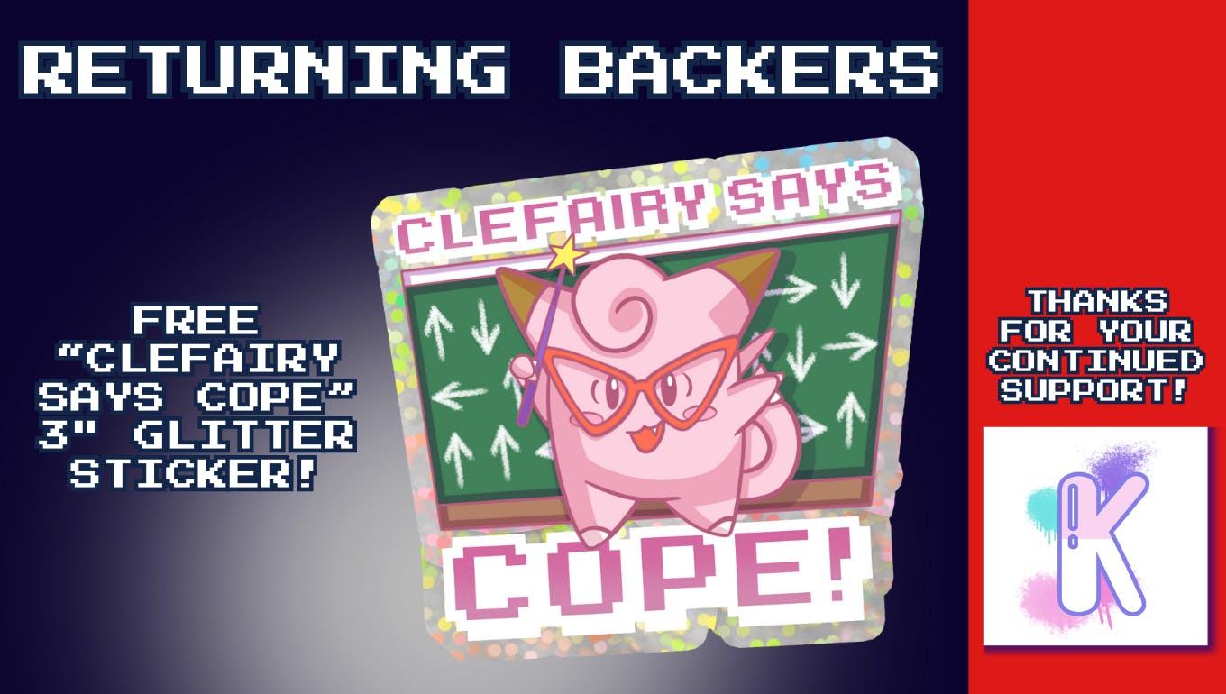 All returning backers from any previous campaign will also recieve a FREE "Clefairy Says Cope" 3" Glitter Sticker!