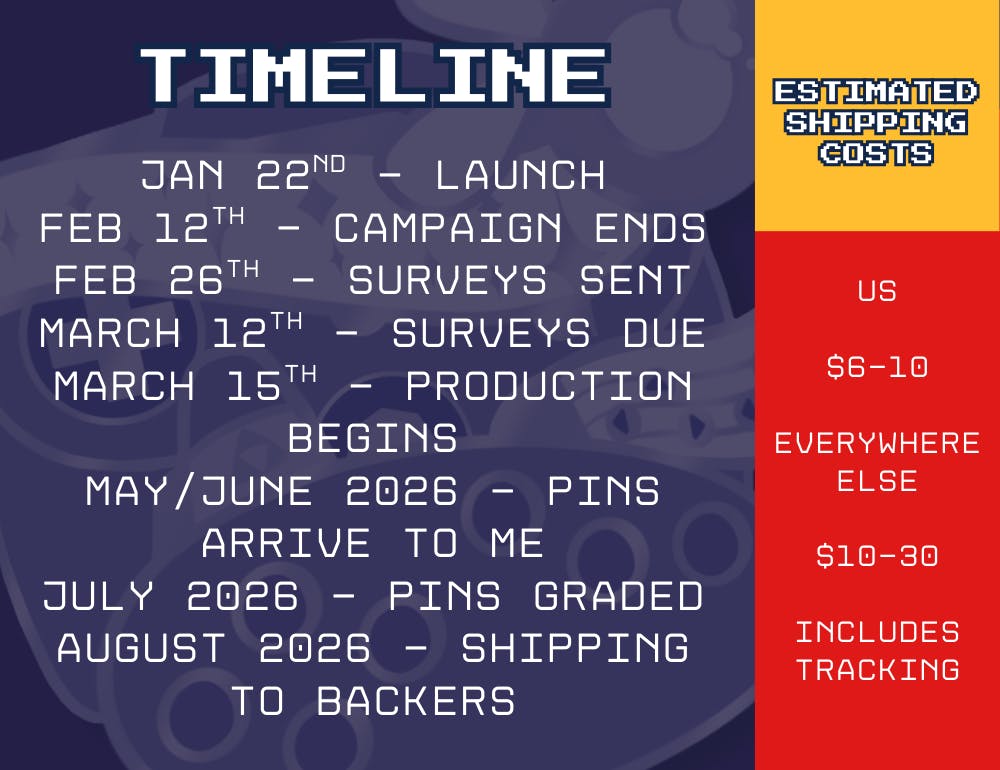 I expect to receive the funds from this campaign roughly 2 weeks after the campaign ends. At that time, I will send out surveys to see whaT pins, stickers, etc. backers want for their rewards! Once the surveys are in, I will proceed to place the order from my manufacturer. The production and shipping to me should take about 2-3 months.